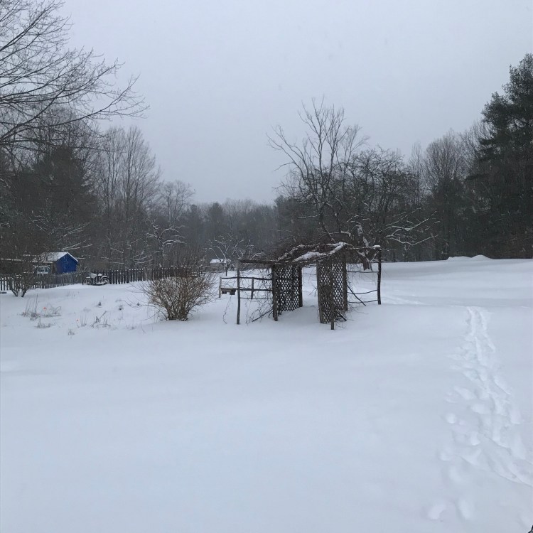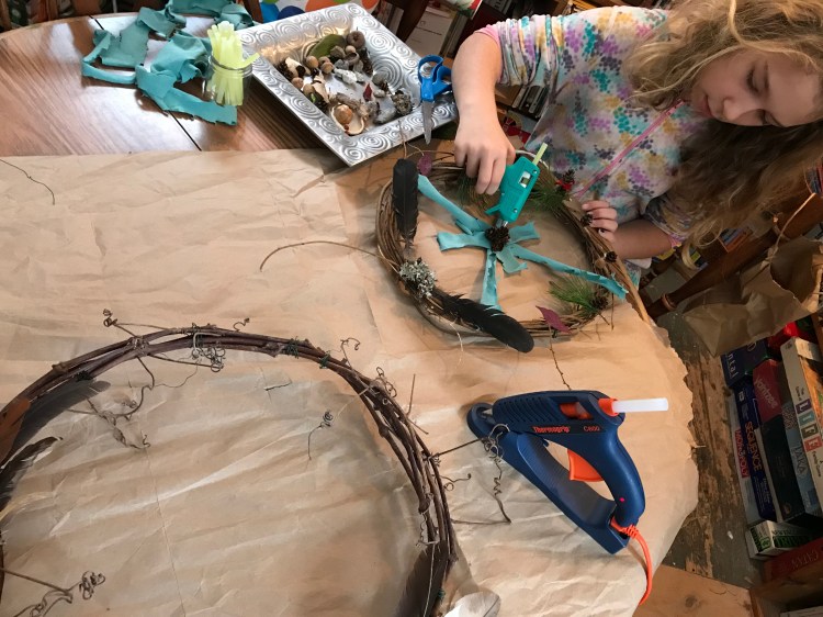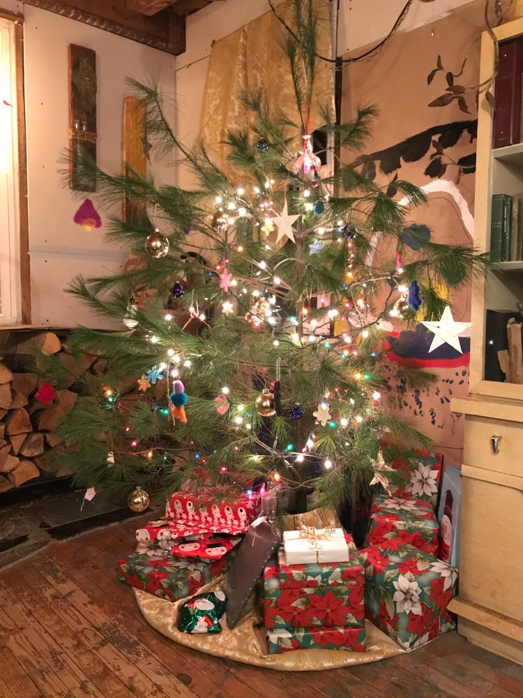 We get our tree from our back lot – I love the sweet airy sparseness of the white pine and since Josh hates them (as a tree, apparently – who could hate a tree? Though not as much as he hates the wild cherry – as it encourages tent caterpillars that decimate our apple trees) so that is the tree we choose as a Solstice tree. And over the years we’ve made many ornaments and have a few family treasures to decorate with – I made a tree skirt out of the old curtains that the seamstress who lived here before us left behind (a lovely gold brocade that was a bit much for me as a curtain but make a lovely tree skirt). When I finally get to do the tree to my liking, it will probably just be dried orange slices, maybe some stringed popcorn but until then, the child loves the rainbow and blinking lights, the salt-dough hearts, the paper origami stars, and felted gingerbread people ornaments we save from year to year.