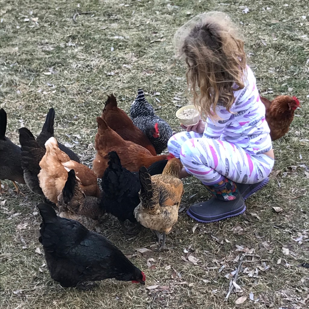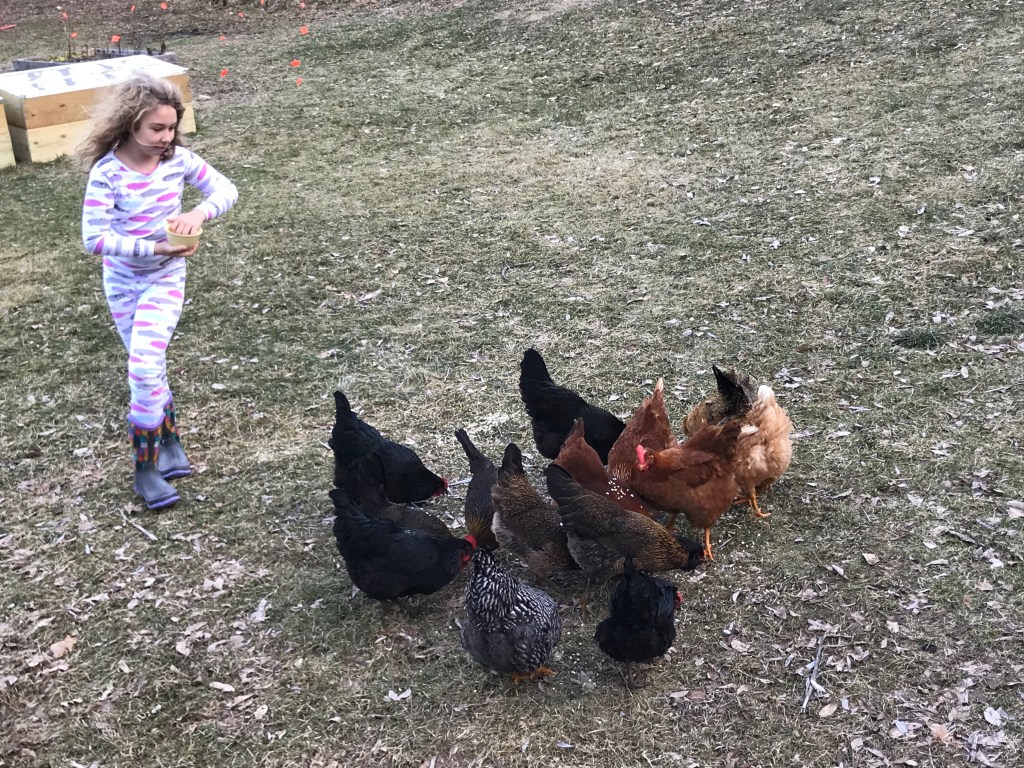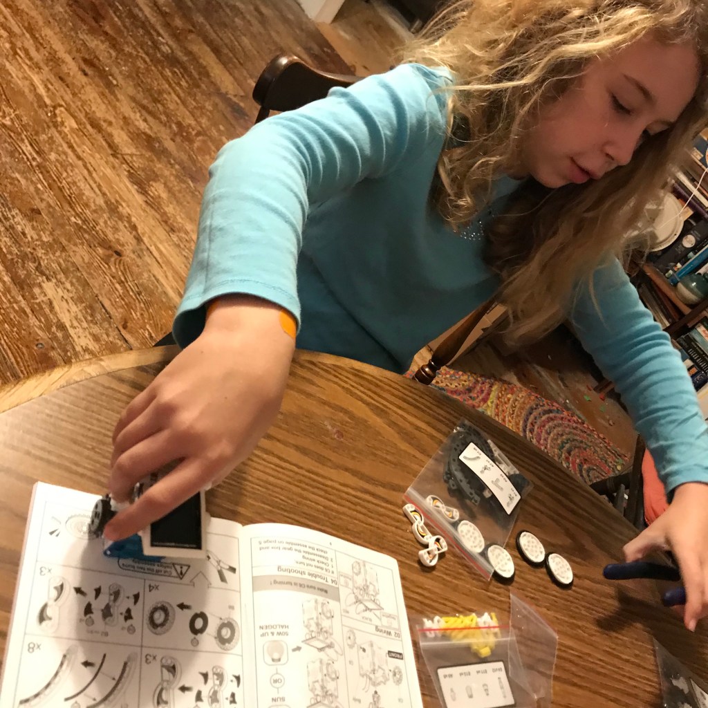 I told you all about her cardboard creations and then she goes and makes a spaceship for the cat, resplendent with buttons/levers/a handheld radio and a helmet – she shaped, designed, and painted it, also adding a plastic bag window (for both the ship and the helmet). Hilarious! Her and Daddy worked on the ‘Women in Science’ puzzle (based on the Rachel Ignotofsky book) and she was excited to be familiar with a couple of the scientists already and she’s been building a Solar Bot. She’s also been sewing chicken neck warmers (yet to be used) and a lot of ‘dancing’ with her new yoga ball. It’s a nonstop crazy party around here most days. She got to see Nana for some fun gifts (new jammies, twinkly lights for her new reading nook, winter boots and animal socks!). Her new favorite book is the comic Snapdragon by Kat Leyh. She continues to bake and help out in the kitchen, and loves to feed the chickens by hand and collect eggs (though the other day she wore her favorite leopard spotted fashion coat out to collect eggs; when there was only one she put it in her pocket and then promptly forgot about and went swinging on the swing – it unfortunately broke and filled her pocket with fresh yolk – possible lesson learned- ha!).