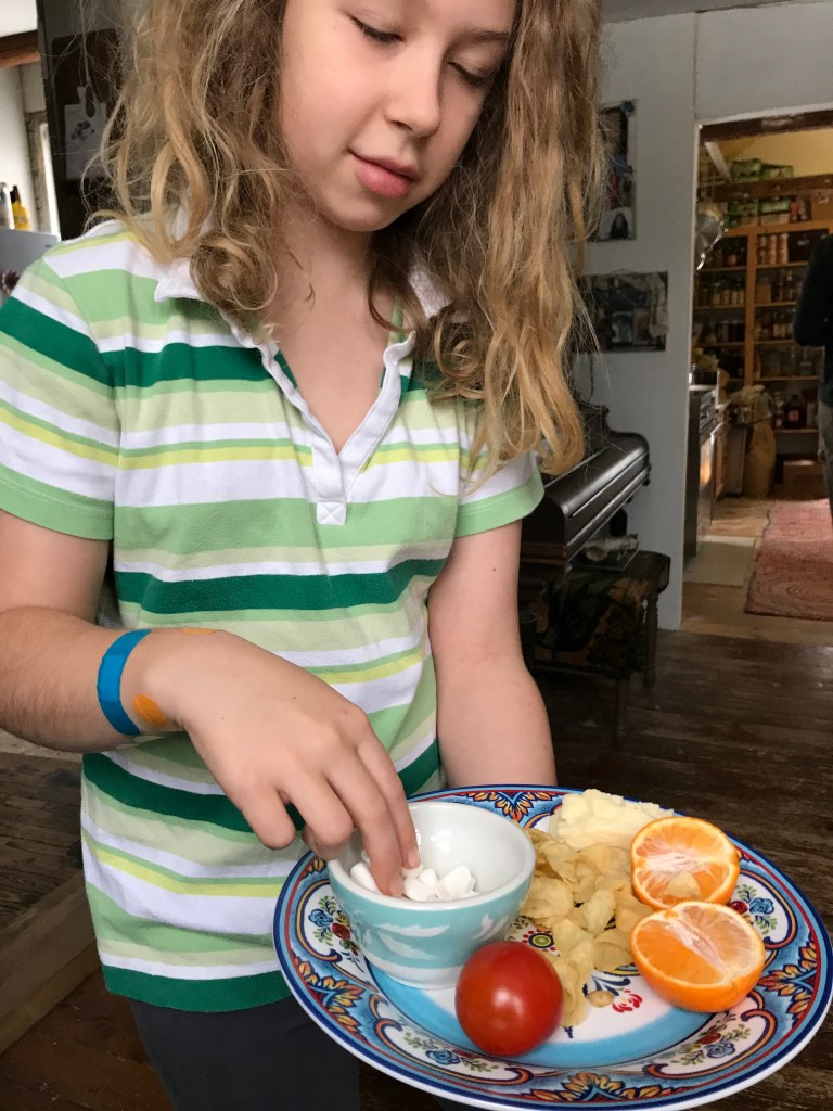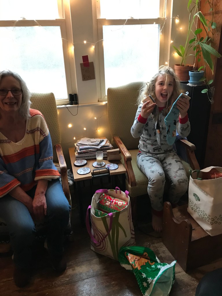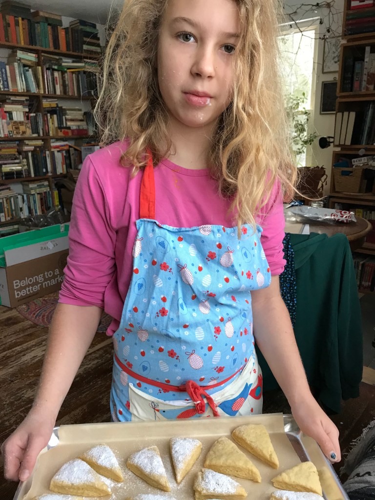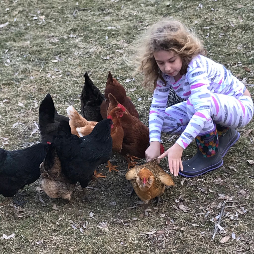 I told you all about her cardboard creations and then she goes and makes a spaceship for the cat, resplendent with buttons/levers/a handheld radio and a helmet – she shaped, designed, and painted it, also adding a plastic bag window (for both the ship and the helmet). Hilarious! Her and Daddy worked on the ‘Women in Science’ puzzle (based on the Rachel Ignotofsky book) and she was excited to be familiar with a couple of the scientists already and she’s been building a Solar Bot. She’s also been sewing chicken neck warmers (yet to be used) and a lot of ‘dancing’ with her new yoga ball. It’s a nonstop crazy party around here most days. She got to see Nana for some fun gifts (new jammies, twinkly lights for her new reading nook, winter boots and animal socks!). Her new favorite book is the comic Snapdragon by Kat Leyh. She continues to bake and help out in the kitchen, and loves to feed the chickens by hand and collect eggs (though the other day she wore her favorite leopard spotted fashion coat out to collect eggs; when there was only one she put it in her pocket and then promptly forgot about and went swinging on the swing – it unfortunately broke and filled her pocket with fresh yolk – possible lesson learned- ha!).