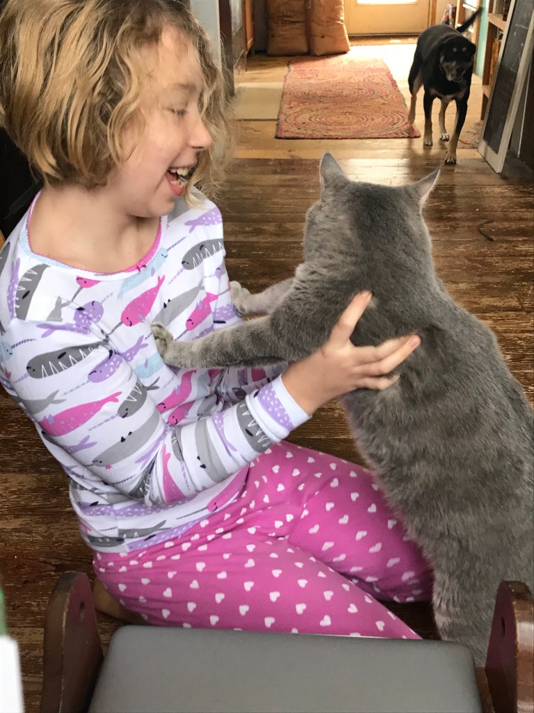 This all goes along with her new game she’s making, and the new fashions she’s been drawing, her Spanish lessons, and the book reports she’s been working on (one for Captain Underpants, and the other for a new book she’s loving Unusual Chickens for the Exceptional Poultry Farmer). She’s also making a full-on Duendesday meal of Pork Tenderloin with a Potato Gratin today and Appelpaj (from her Swedish crate).