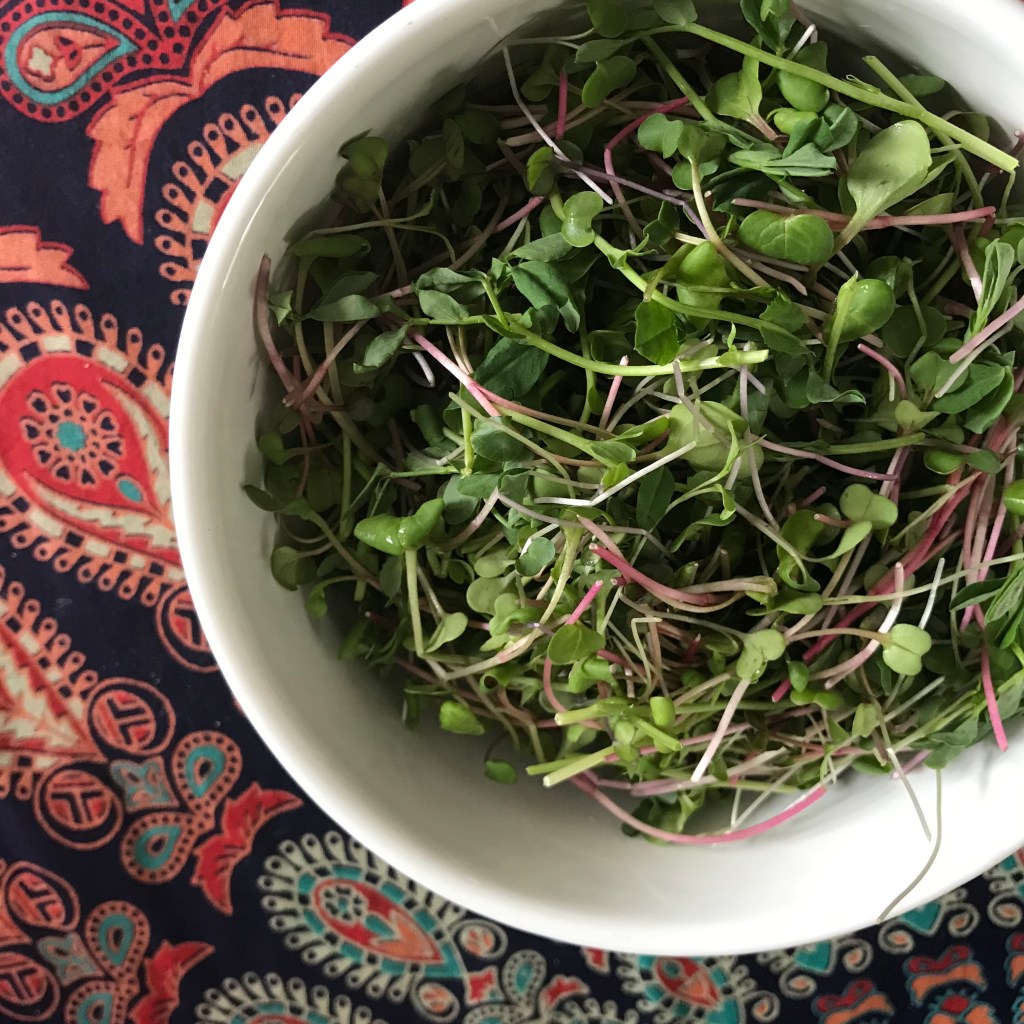 Like tonite. Tonight we are likely (I haven’t made it yet so I’m speculating based on what’s in the fridge) to have little salmon filets with roasted cauliflower, over a bed of CSA young salad greens and sprouts, local feta, and toasted pine nuts – the kid will likely refuse the cauliflower and have cucumber (she’s not a cooked vegetable kind of gal, that time will come, we don’t push it, as long as she gets a veg in), served with thick toasted slices of parmesan bread (it needs to get eaten up!). The salad dressed with some sort of sexy vinaigrette (I came across some honey balsamic vinegar this past Summer, mmmmm).