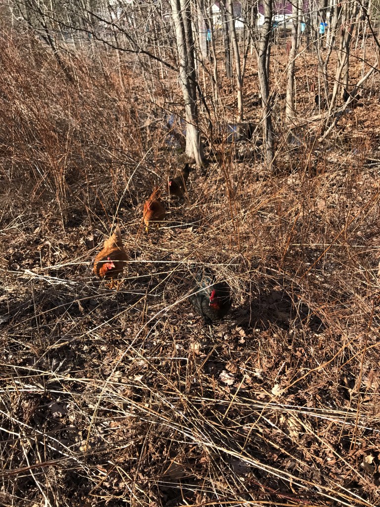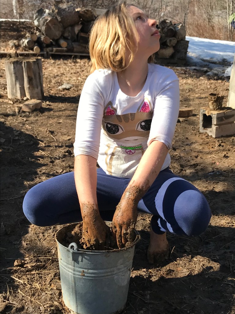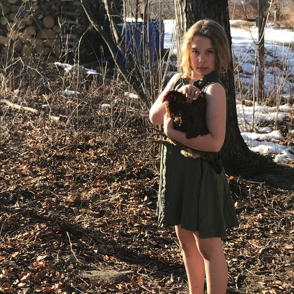 The marvelous child has been up to loving the sunshine (cheer, cheer, cheer, like a cherry in my ear) – hula hoop tricks, mud baths, and egg hunts. She helps with the sugaring, the chickens, and has been collecting basketry supplies (mostly willow and bittersweet vine). And those chickens, well – they have been loving going off into the woods lately (makes me a bit nervous but ‘forest chickens’ are sort of a delight to wander upon). They have only been out for 2 hours this morning and I have already seen them traverse the dooryard, the orchard, the garden, and now they are working their way across the lower lawn – they get around!
