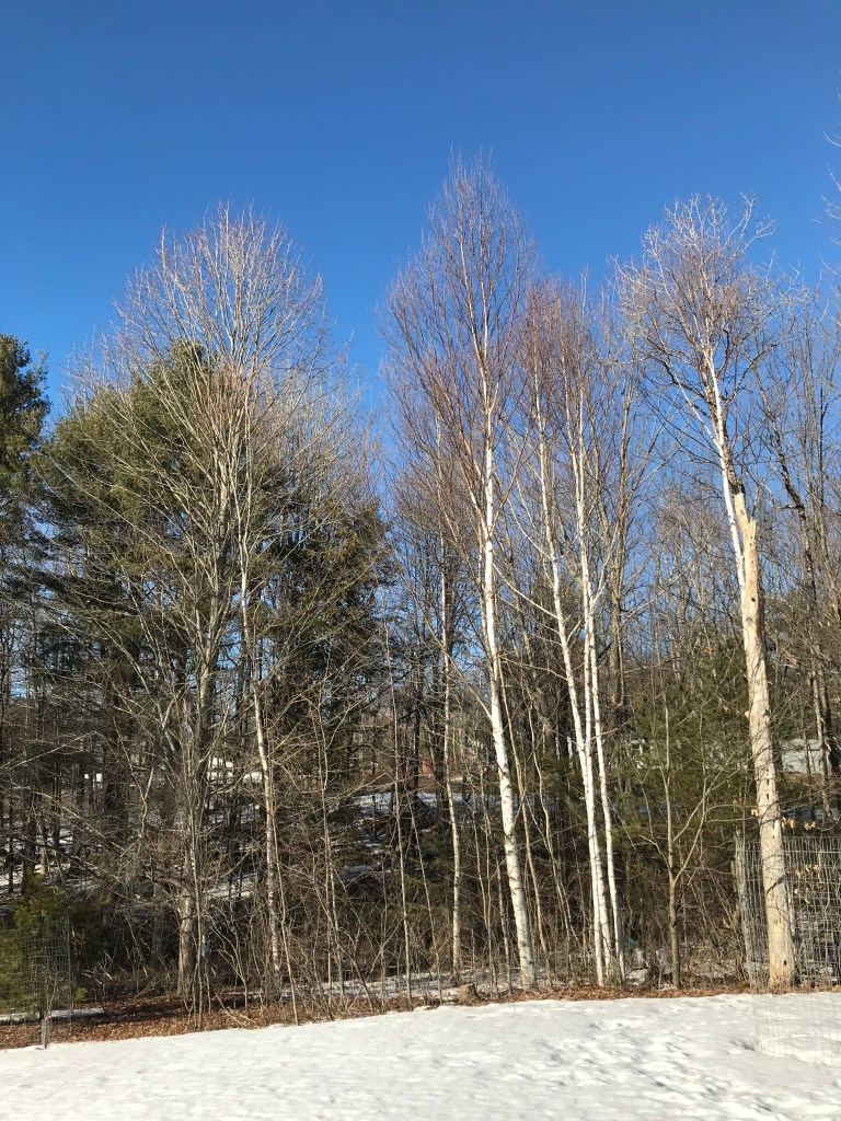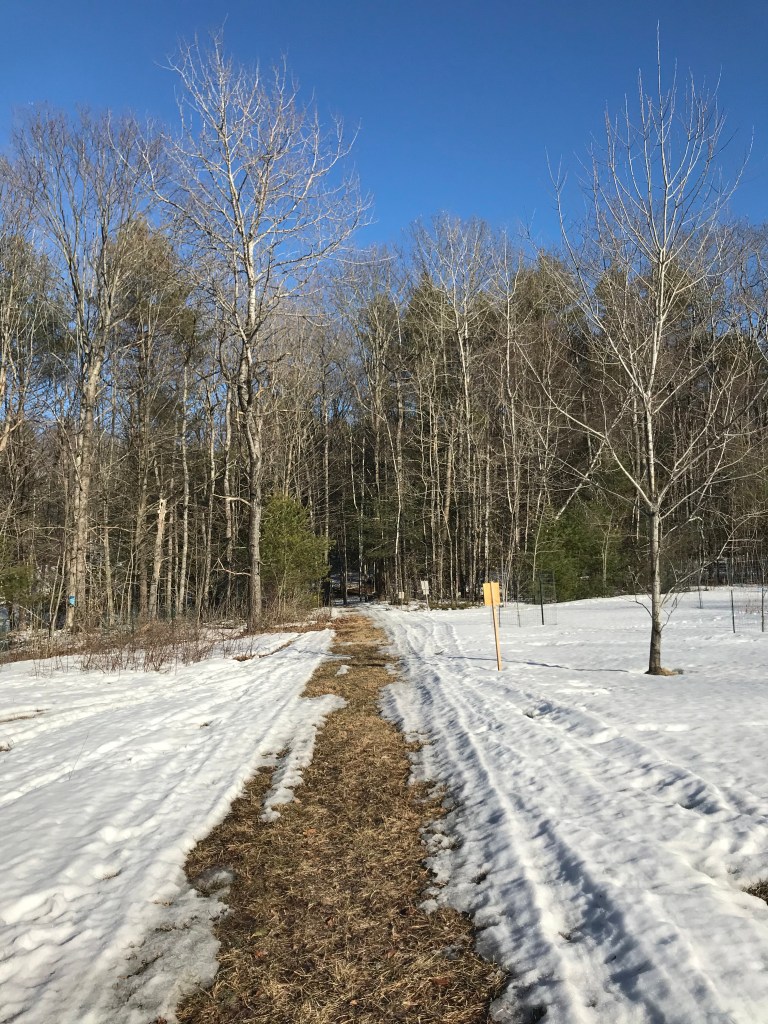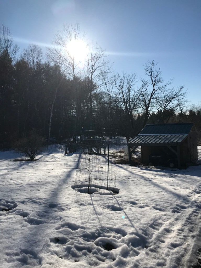 Meanwhile, it’s officially Spring! Yay! Happy Spring! The snowmobile trail has been closed (though with the weather it seems it was a seamless transition from the sled to the motorcycle for local folks), and buds are swelling on the lilacs and the silver maple tree. There is still plenty of packed snow in the shady areas of the hill and woods but the garden is bare and the lower lawn can finally be seen again. I am still suspecting another snow but the ground will be thawing underneath at that point. The woodstove is still warming our nights despite my opening windows during the day.