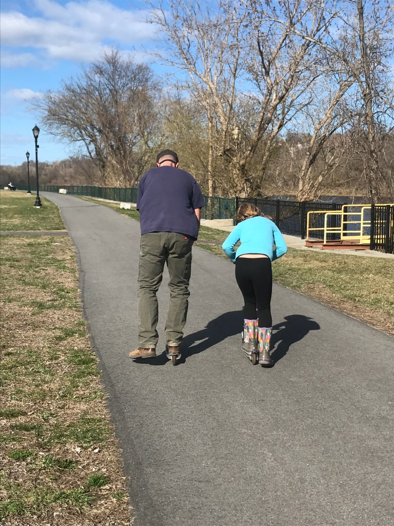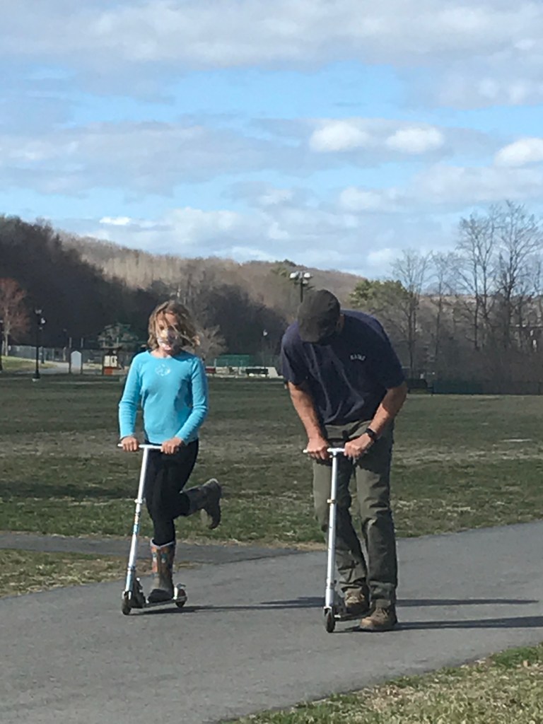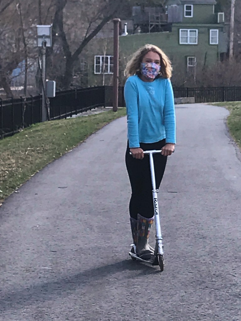 She’s an opportunist for any moment to scooter; keeping not one, but two scooters in the car just in case she can convince someone to scooter with her. When we finally made it to the Farmer’s Market (after a long Winter), Duende was less interested in the farmy bits than the paths for scootering along the river. She saw a pair of Mallard Ducks, an otter, and some old car tires (the latter she was convinced ended up by the river because someone drove their car down there rather than just threw their trash in the swamp). And though it was a small market this week (not quite in its ‘real’ season yet – but jumping in early due to the calm/bright weather) we managed to get a little something from everyone – Duende convincing us that we needed a cinnamon roll snack (mmmmm).