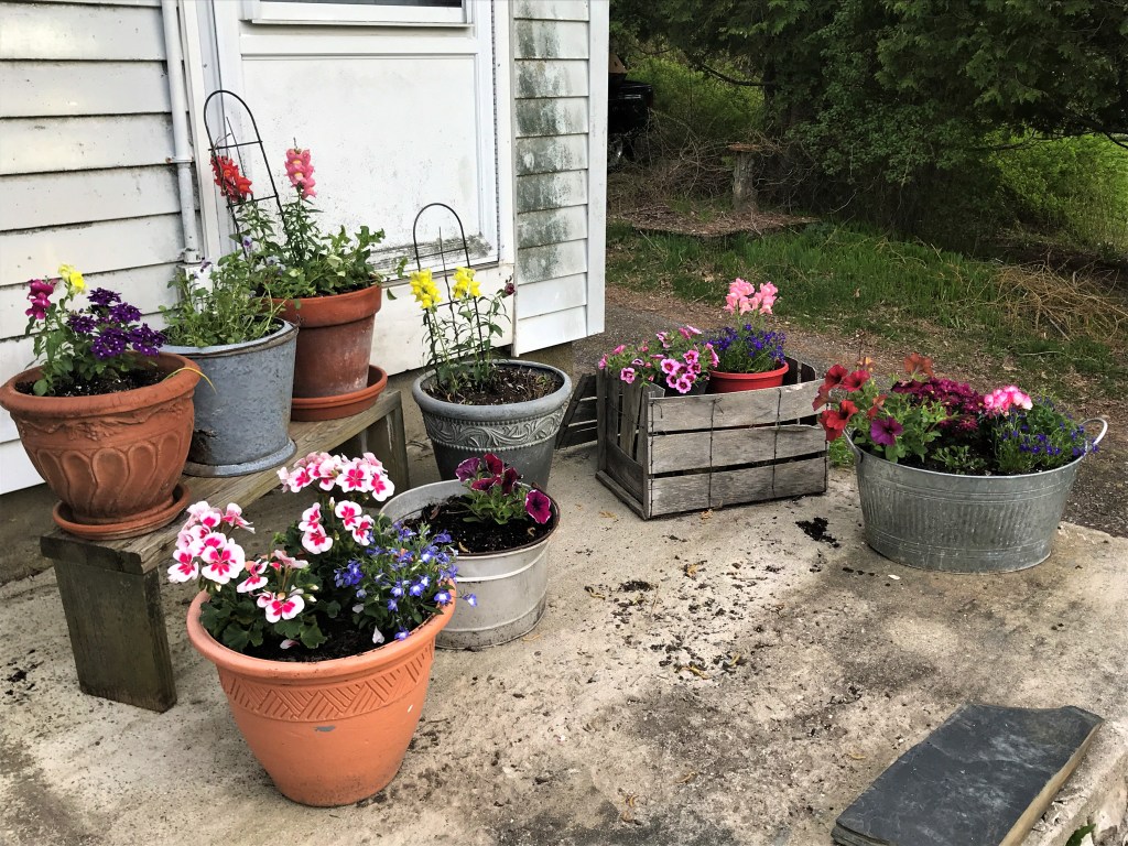 The weather has truly been co-operative and lovely lately. A real full Spring, which is rare around these parts; generally we have a lot of rain and maybe still some snow and the last frost is no joke. And because things are a little different, we might struggle later on (if we don’t get our water tables up! but then again, if the ticks don’t recede, etc) but right now is quite the sweet spot. Dandelions everywhere, the Apple Blossoms are about to burst, there are swelling buds on the Grapes, and the Garlic is looking fine. We somehow even managed (well, not I; the man and child did all the work) to weed and mulch the Strawberry boxes and plant a slew of goodies. I went a little crazy this Winter (who didn’t?!) and ordered all kinds of things so more goodies are sure to arrive (shade plants like Amber Coral Bells, cottage flowers, and Ramps!) and then there are all the lovely seedlings I’m growing (late, but strong). As a last minute party favor, Duende and I went to the local greenhouse in Winthrop and bought a bunch of porch flowers just to invite more Spring to stay.