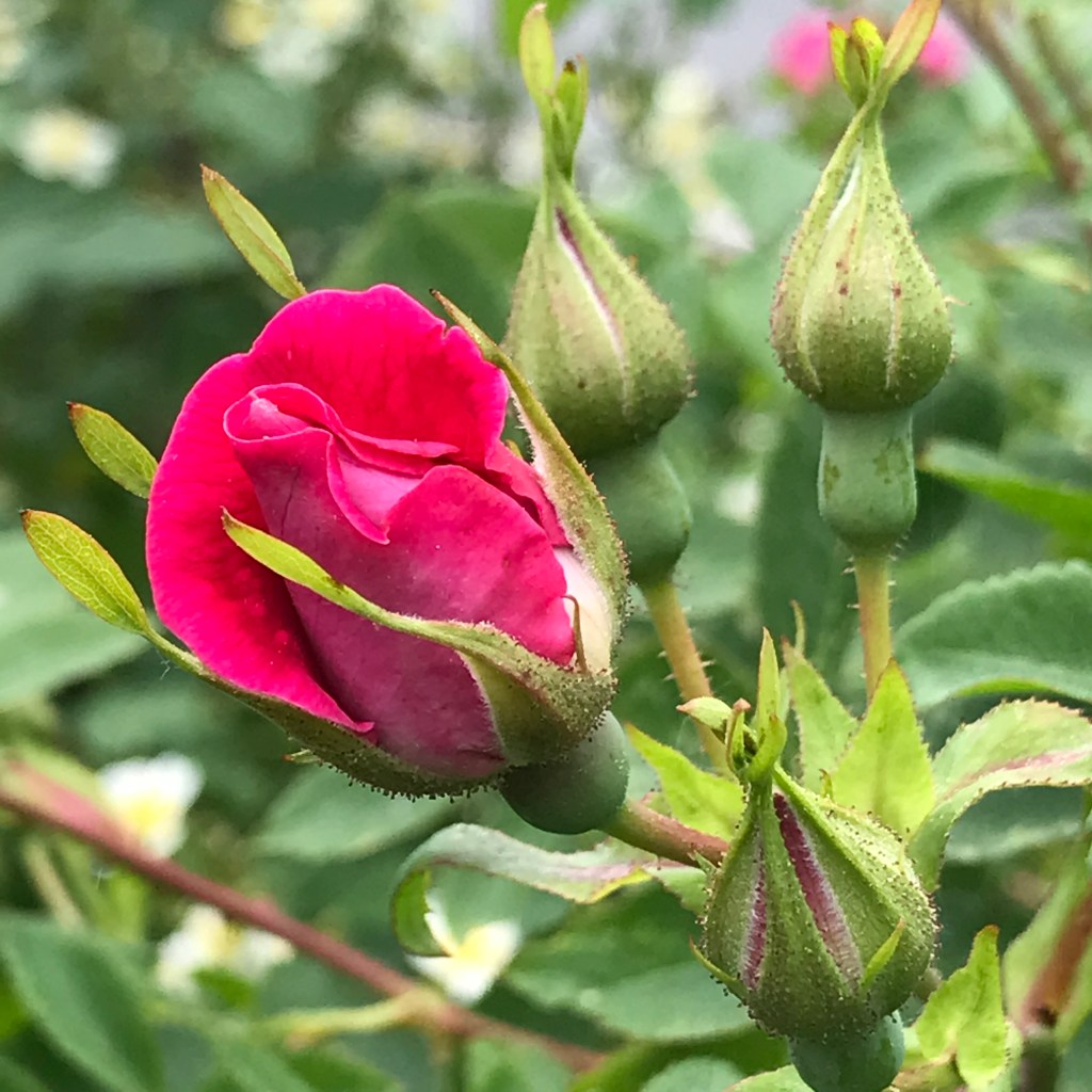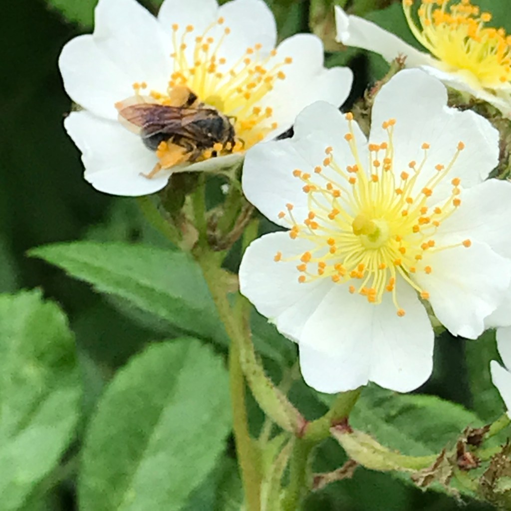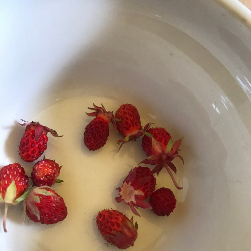 Thick breezes blowing hot air around there – focusing on inside things where it’s a bit cooler. The child is making a lot of arty bits today at our new giant art table that Josh customized for us (paper roll on the end, shelves for her at one end with fancy organizing boxes, the same for me at the other end, thin pocket pencil drawers for us on either side and plenty of room under it for our stools and art carts – it’s really a dreamy table to go with our dreamy studio). I should be making student calls and finalizing the garden to-do list but instead I’m battling allergies and feeling off-kilter. I went for a wander in our overgrown (& what feels like a rainforest) lawn to see how the wild roses were blooming and found so much more. So many lovely birds right now outside my window at the feeder (right now a bright Mr. Cardinal having words with the Catbird that lives in a bush nearby) – and bees, and dragonflies, and butterflies – a Great Blue Heron just flew overhead!