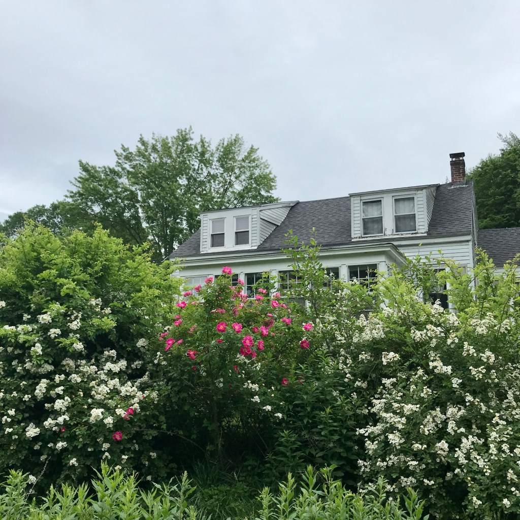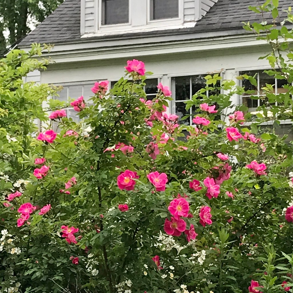 - Let’s address the ‘rose issue’ around here. When we moved in, there were new rose bushes lining the driveway in a railroad tie raised bed, and a few cultivated rose bushes here and there. We’re not ‘rose’ people, per se, as I prefer a more low-maintenance kind of flower and the culture of them is just too intense for me (likely same with peonies, or irises, etc) so we removed the raised bed and sold the roses. However, our entire property is peppered by wild country rose – a crazy invasive bush with tiny white rose flowers that open fully and last a week. When we find them, Josh tries to hack them back into “proper behavior” or we move them to the road front. I envisioned a Disney Sleeping Beauty hedge, very Maleficent – thorns, leaves, a wall of separation from the logging trucks and jacked up pick ups, etc. and it is turning out as I had imagined. It’s a lovely rose hedge – in flower right now – of mostly wild rose but occasionally interrupted by other random roses. It’s a fence, but not a fence.