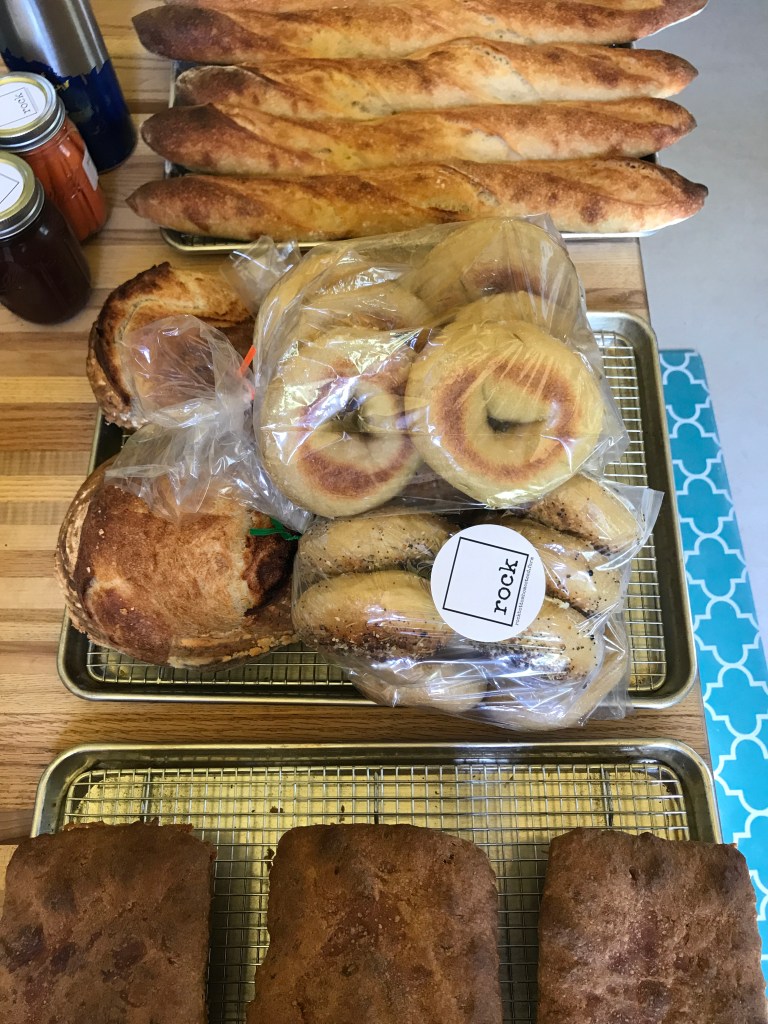 And then, there are always the day to days – Tuesday is Baking Day! Josh gets up nice and early, turns on the oven, pulls out the doughs to come to room temp, and gets a cup of tea. He prints out the orders, replies to any emails or confirmation invoices, eats a thick slice of toast, and gets to work. Bagels, Flatbreads, Pizza Dough, Crackers, and almost all of our jar goods are made before delivery day (sometimes the Fresh Ricotta is made the day before, sometimes the morning of…) but all the breads are baked same day (Sourdough Boule and their mini counterparts, Baguettes, Sourdough White Loaf, Rye Loaf, a Pretzel Braed [yes, that’s how he likes to spell it – see, it’s braided bread!], Parmesan Boule, Oat Loaf, etc). And then he bags them with folks’ names on the bags (along with our stamped logo, which he also prepares), fills the cooler with cold stuff like Kimchi, Fresh Ricotta, Eggs, and gets any pickles/jams ready that were ordered. Then he makes coffee, gets a snack together for him and the kid, packs the tiny car with all the yummy goods, and hauls it all down to make delivery in the Portland/SoPo area.