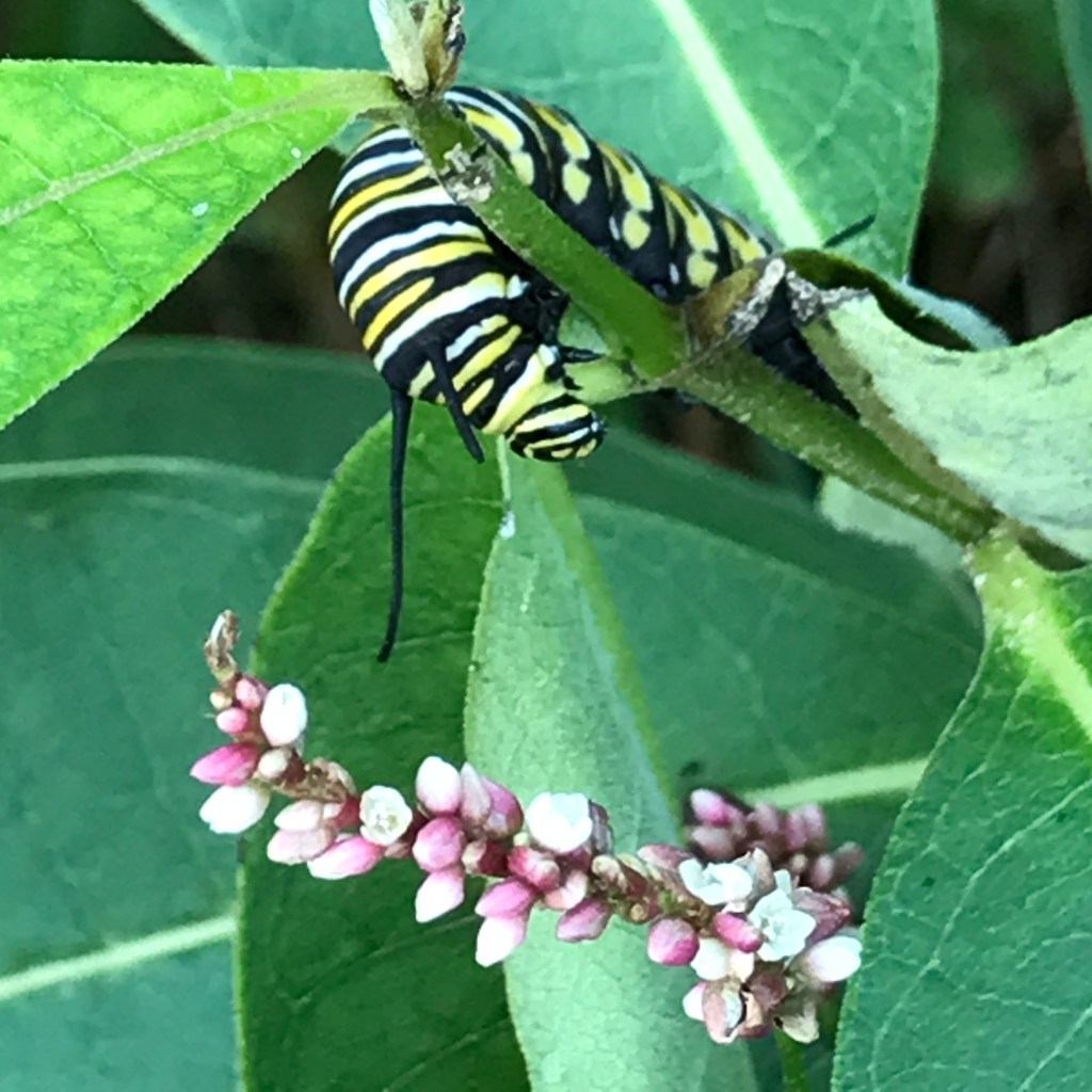 We used to have this lovely large patch of Common Milkweed in the upper back field – I based an entire garden around it, separating it into large wedges with picket fencing (which my marvelous man made out of pallets) and dreaming of a classic or at least interesting sundial in the center. Something happened to the milkweed – the last couple of years it has been waning little by little and now there is little left. I think next year I will have to rake in some seeds in the early Spring (if I can, or maybe I should do it this Fall) and hopefully it will return. Instead, I have a small scraggly patch around the well-cap (a ubiquitous sight here in Mid-Maine, ugly well-caps across lawns everywhere!) and a few here and there (in La Petite Jardin, in the yard, a few in the garden) where I have been lucky enough to spy little stripey Monarch caterpillars munching away (we may still bring one in to cocoon indoors and then set him free – the child likes that process very much, and since we’ve been missing the yearly Bug Fair, it’s a nice connection).