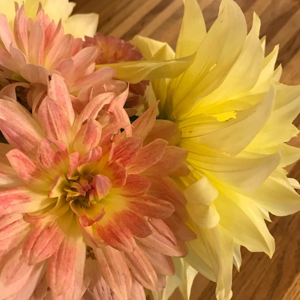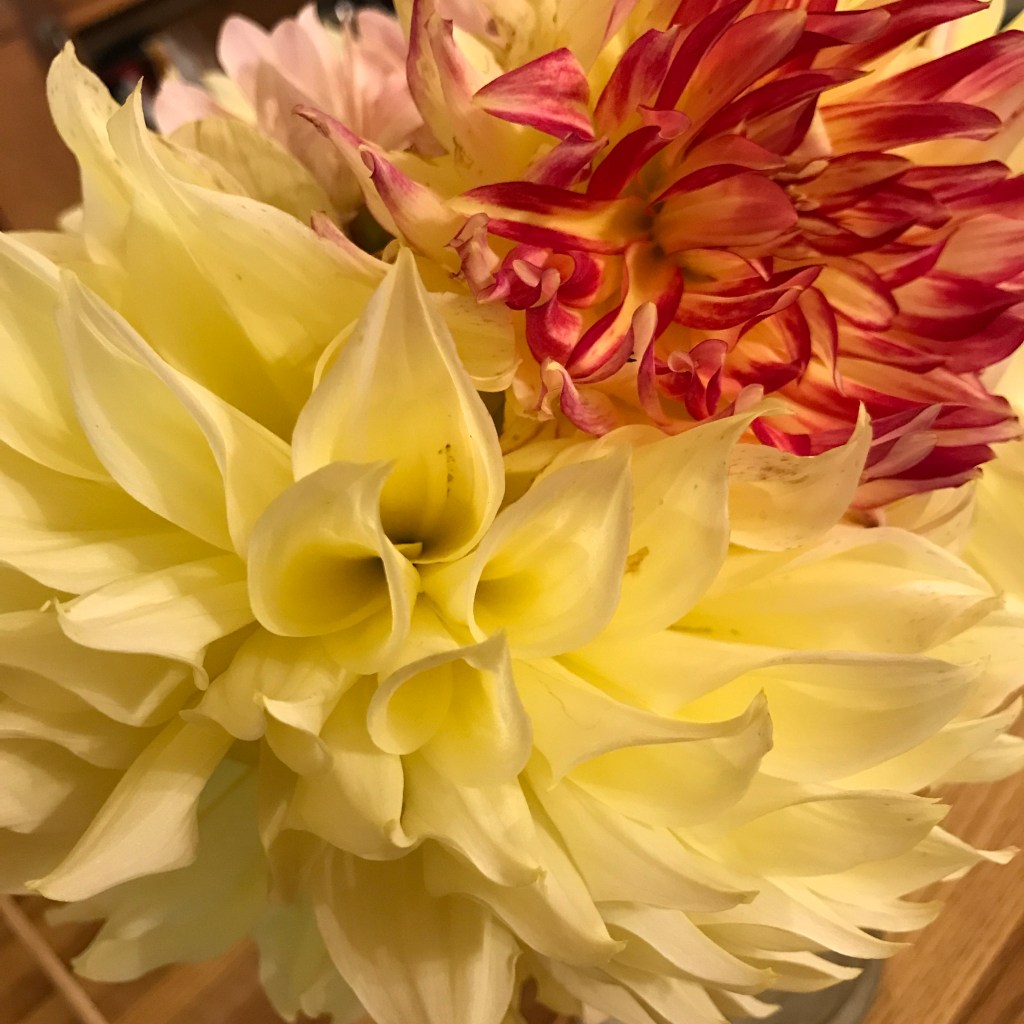 And alas, it seems the weather has finally shifted to its nearly appropriate climate – the woodstove made its fiery seasonal debut yesterday since our mornings are officially in the 40’s. Though my dahlias and cosmos outside are not giving in yet and the Fall raspberry bushes are still fruiting, there were even purple pole bean blossoms on the vines. The bees fall into cool little naps on flower faces, the ash leaves cover the coop yard and the driveway (our only 2 trees that drop leaves – all at once – where we might have to clean them up), and the sun gets a whiter brighter hue to it as it streaks across the still green grass. The garlic is in, the hanging plants have been taken up, the ceramic pots are back on the porch, the outside wooden furniture is put away.