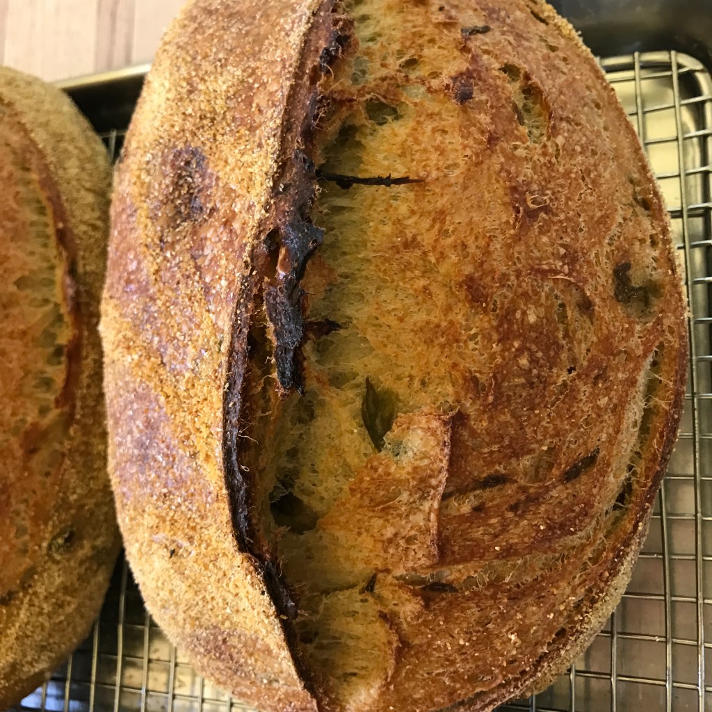It was a very busy morning for the baker today! Because of the long weekend, he was up early at 4am to make the (generally Monday) morning bagels for the ReVision Energy folks and then instead of sneaking back into bed for a couple more hours of sleep, he had to jump on the regular Tuesday baking and delivering schedule – whew! I bet he’s going to bed early tonite! But the breads are beautiful (and delicious – I cannot resist a freshly baked bagel or slice of yummy bread with butter!) and he is off in the world with the peach delivering his goods.