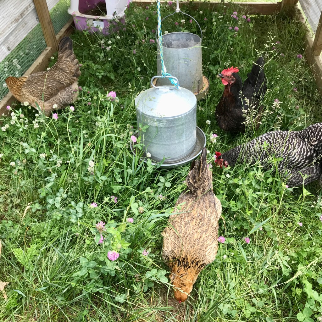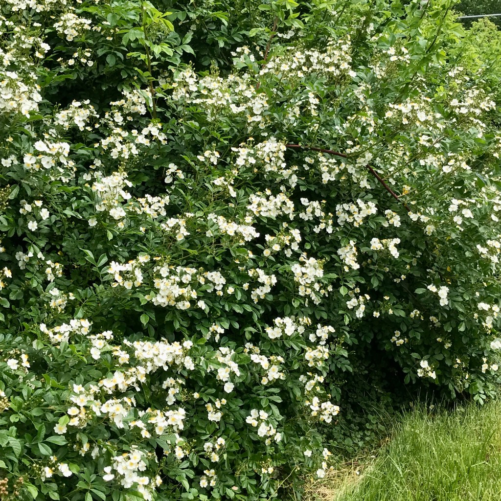 When we first moved into this charming little house (circa 1850) on a spit of land, there were two sort of imposing/sort of sad little Douglas fir evergreens in no sort of sense in front of the house along the road. They had been topped, so any character they had was gone and they were together but off center – really looking silly. So we removed them and considered a fence along the road frontage. But fences are finicky and expensive and with our free roaming chickens (seen this year in their tractor house), we needed something less penetrable than the open cedar farm fencing we preferred. So we started putting in all the wild rose that we dug up from other portions of the property. It grows crazy here.