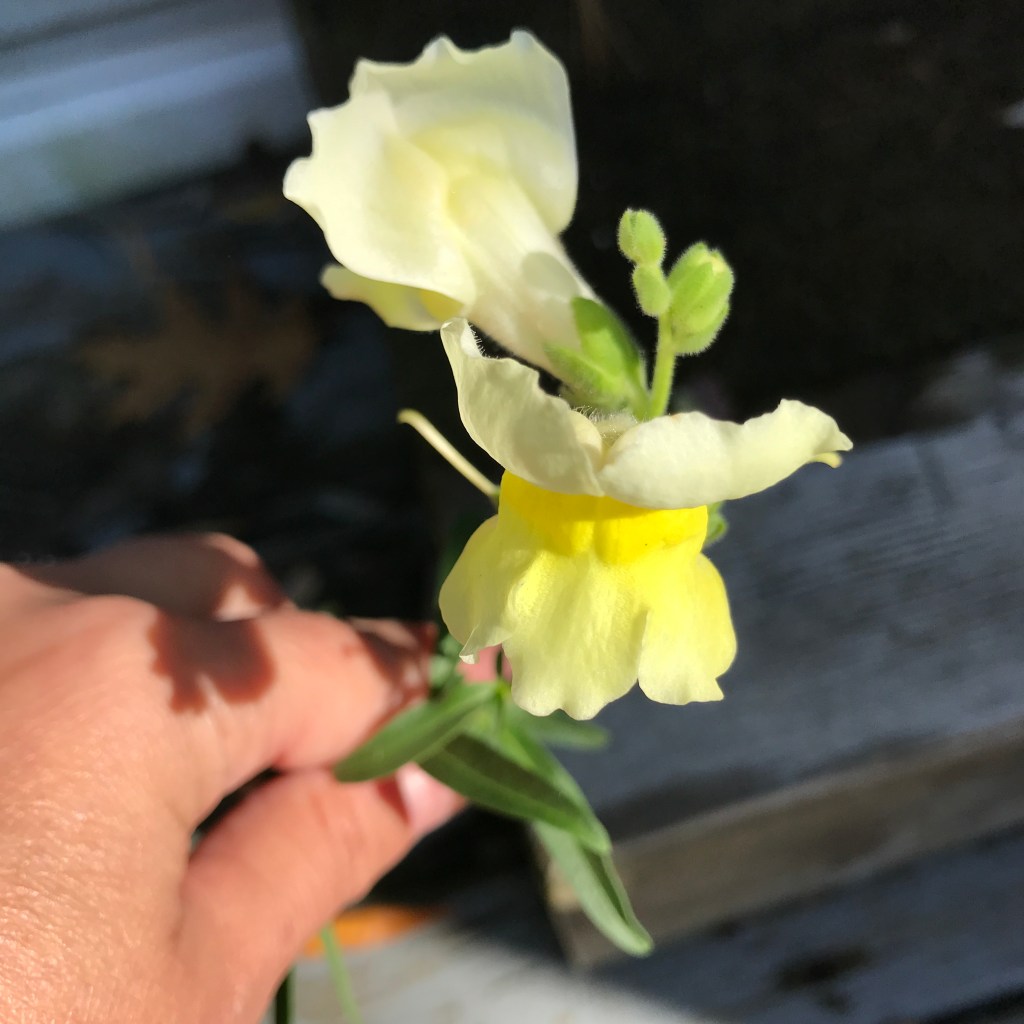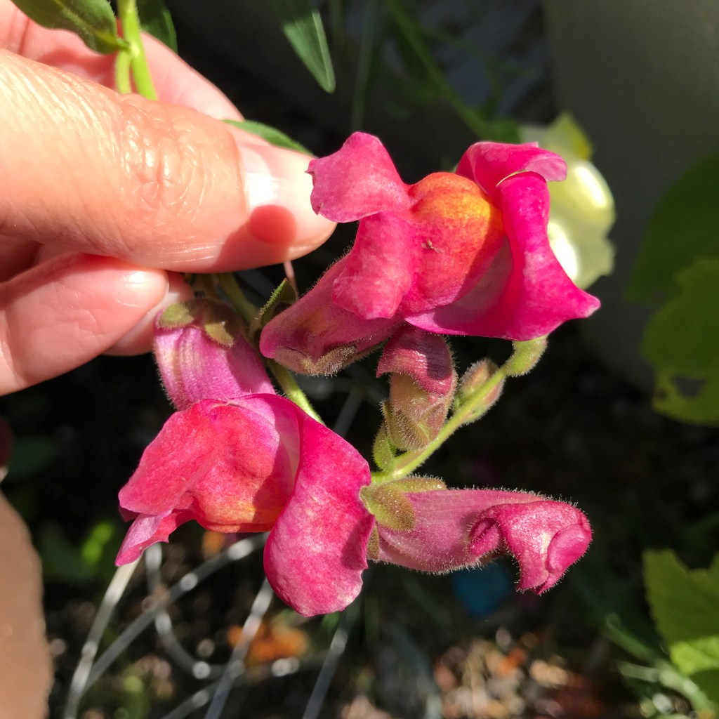 Many of our ‘plans’ didn’t come together because we’ve been waiting on news of the store and finagling business accounts, etc and we’ve ignored the garden (but maybe as long as we can – those garlics have GOT to get in! But the deer have eaten all my beans, broccoli, and Fall snow peas though I could still pull my carrots and have Asian greens coming up, the Fall raspberries are still fruiting, and the Calendula are still blooming and seeding) in favor of attending to each other. And so far the Snapdragons are holding their own in stunning little colors, the Driskell mint is big and strong, and my Witch Hazel subtley bloomed while I wasn’t looking.