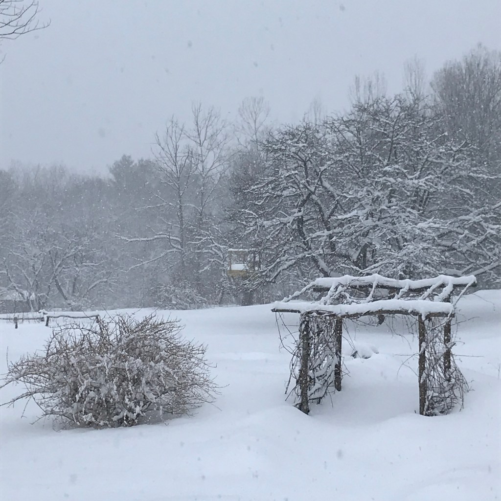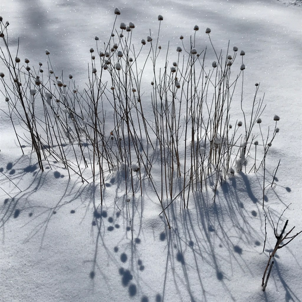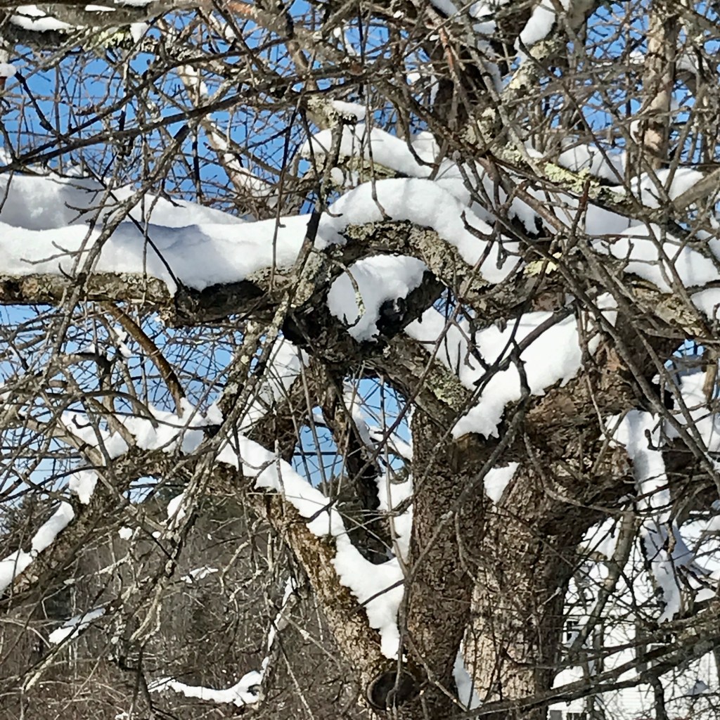 I watched for awhile, not sure if I was seeing young antlers or just alert ears in the dusky moonlight. They hopped over the snowpile, struggling a bit and perused the driveway. A car drove by scaring them back under the arbor vitae where I know they like to come down and nibble. They know they need their Vitamin C – between the deer and the birds, the tiny rosehips have disappeared, too. They have to fight ticks as much as the rest of us and keep their immune systems up for good health. I’m less thrilled when they nibble down young apple tree tips, and when they decimated my Fall peas and calendula last year but that is partially our fault when we do nothing to discourage them (y’know, like fences?!). They gotta do what they gotta do.