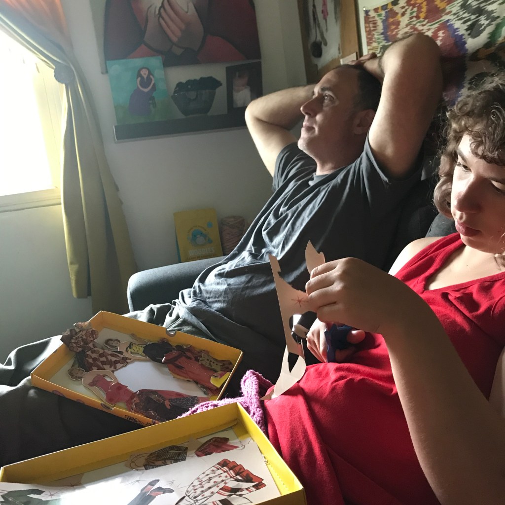 These days it’s either work or the pool (best pandemic purchase ever! it’s not a big blow up pool but all three of us can be in it and she can still swim-dance/splash around) for this gal. On Tuesdays she’s known to be on her skates, in the shop, on delivery, at the Farmer’s Market — it’s become a signature of hers (as well as her ‘layered’ fashion sense). And at home she’s been cutting out retro Retro paper dolls (even their retro is retro now), upcycling (cleaning, repainting, and making wrapping paper) gifts, embroidering and sewing, reading, and putting on shadow stick-puppet shows. We came home to snacks, our coffee chairs in front of the table (like a theater), and were welcomed with a cardboard remote to change the puppet tv channels (hilarious – Chanel 4, Old Ladys Shop, This Bird, and others).