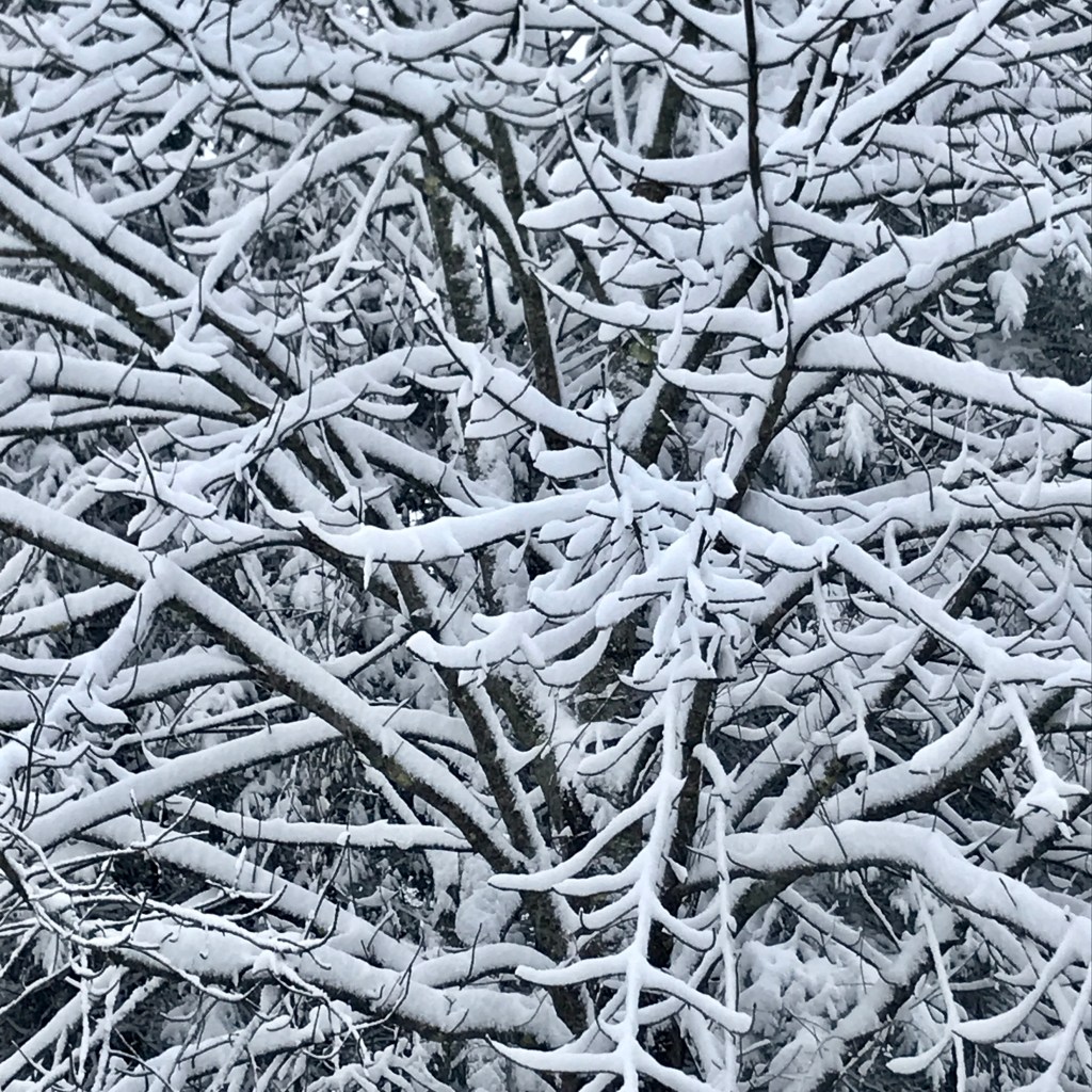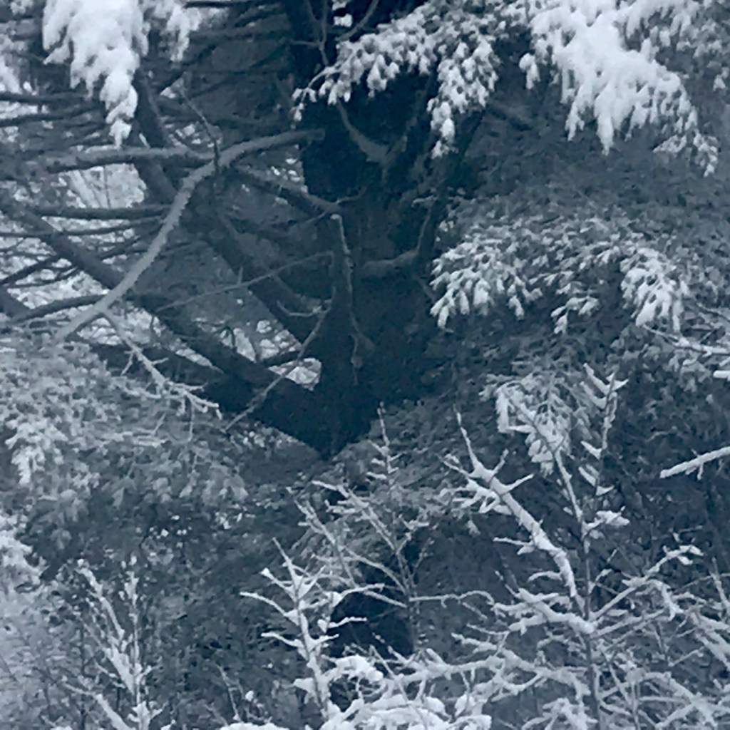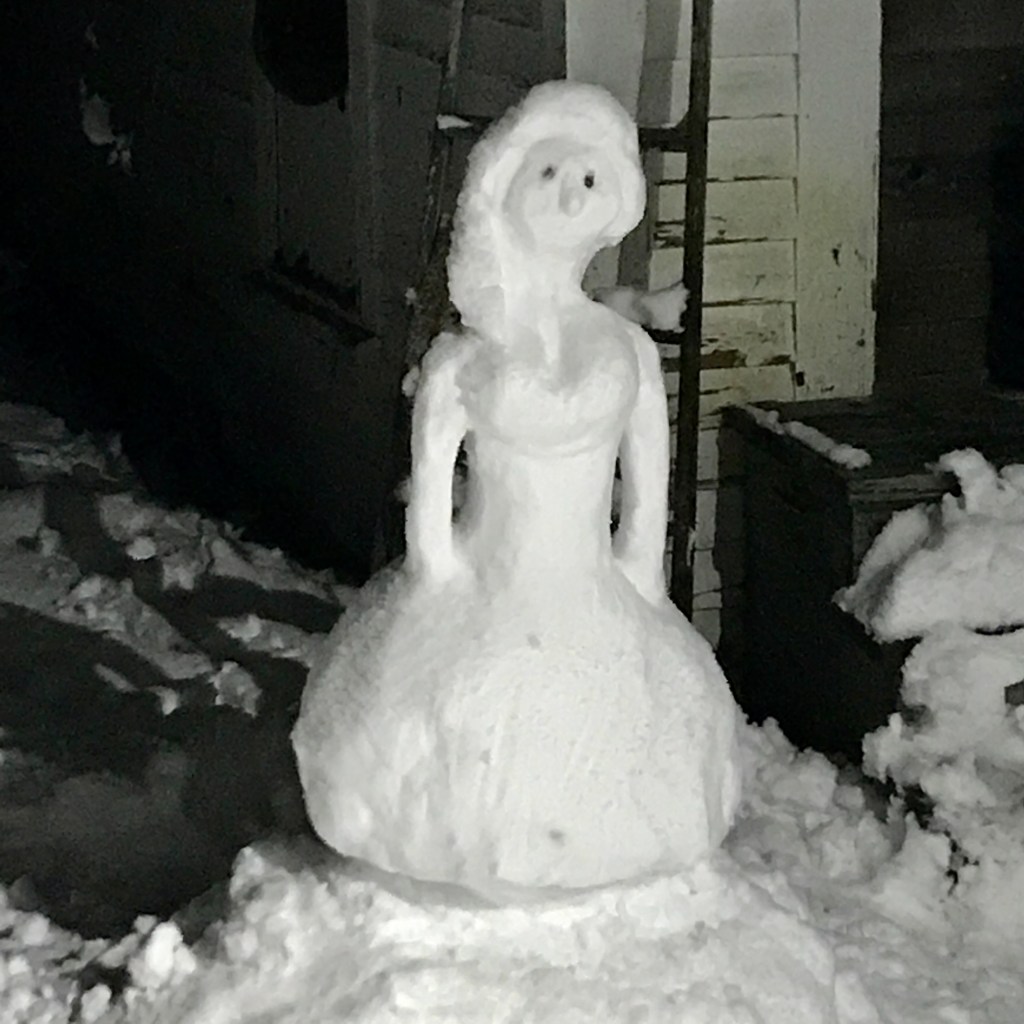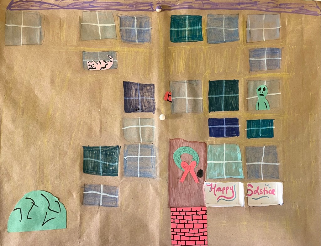 At the homestead, the snow is a little deep and hangs heavy on the trees. A snow gal is watching over us in their ballgown, the silhouettes of deer munch under the apple trees and alongside the rose bushes, holiday decorations are being pulled out and readied — the event calendar opened and shared. With windows telling us to have a pancake breakfast, spa day, pomegranates, chocolate/candy treats, books, records, lottery tickets, family singalong, game night, go on a country drive to see night decorations (with car popcorn and pop music), open gifts and stocking stuffers, with a final opening of the door on the Solstice where we get take-out! D makes a new decorated facade every year over our designated type-tray squares. This year with cut-out figures in the window like a cat and an alien (why not?). We’re thinking about going out to find our ‘Charlie Brown’ white pine sapling for our Solstice tree today (it’s how J keeps the population down in our back field and I like the sparse airy openness of the white pine saplings, beside the free-ness).