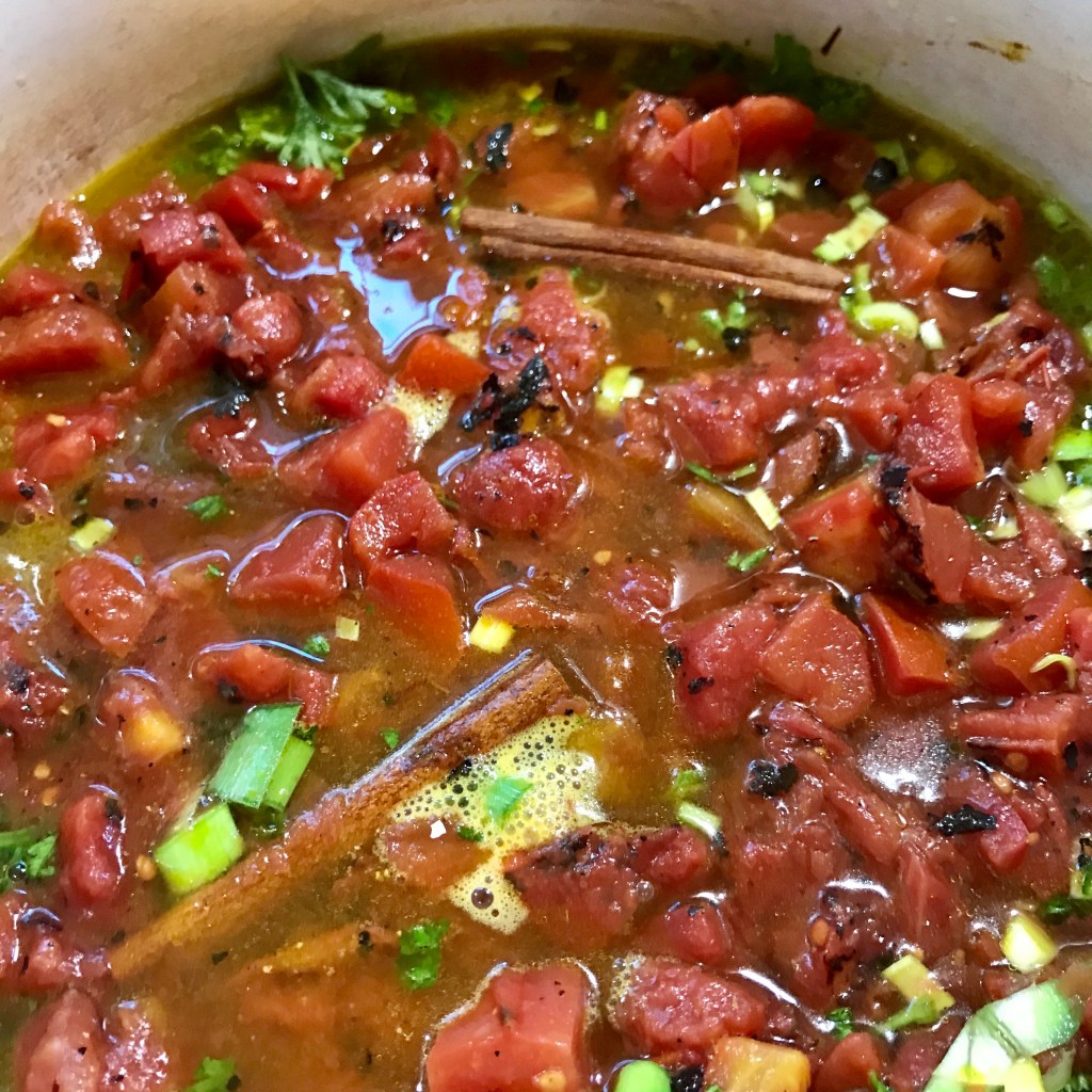 Saffron, cumin, and cinnamon are the super combo that makes Moroccan food so dreamy and deep flavored lightened with lemony brightness. And they shine in the lusciousness of Harira — a fortified stew eaten generally in the fasting breaks during Ramadan. Meat, eggs, lentils, and garbanzo beans are the proteins while the noodles and thick broth fill you up. Flavored with parsley, celery, tomatoes, and onions, it is really hearty fare. I tone it down a bit by eliminating the lentils (and celery — mostly because I don’t have it on hand because I’m not a big fan), reducing some of the onion, and using canned chickpeas and tomatoes, and sometimes adding a bit of cilantro at the end. There are versions without the egg-lemon mixture but I don’t find them as interesting.