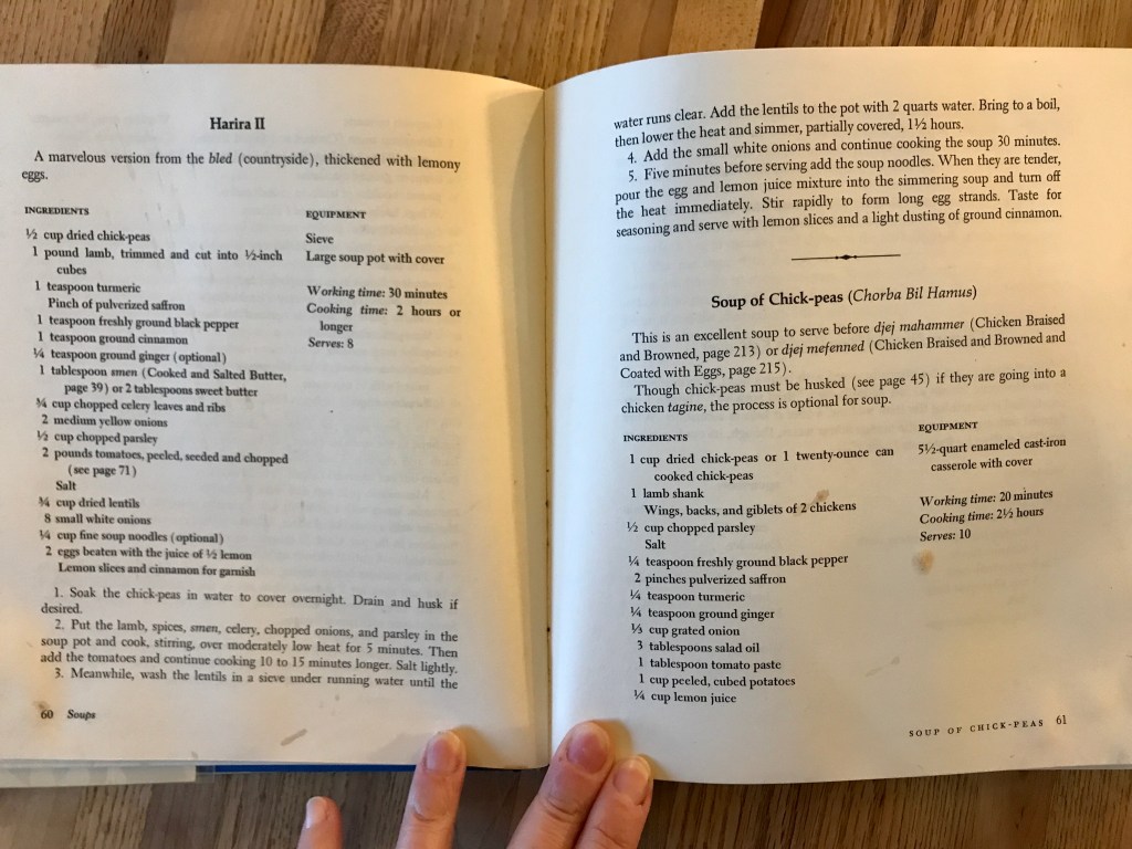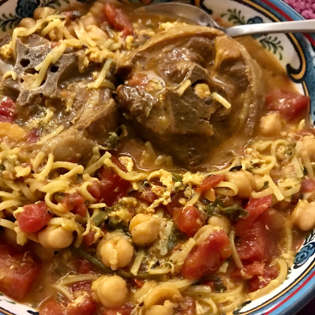 This is from Paula Wolfert’s original Couscous cookbook, a book I found by chance at Rivendell Books in Montpelier, VT a million years ago (ok, maybe 25) and use it often. I love Paula’s authentic processes though I adapt many that I make regularly to quicker versions. In this version I use lamb necks (salt on both sides). I heat ghee or butter with a little oil and add a healthy pinch of saffron, turmeric, ginger, black pepper, chopped onion and chopped parsley to the pot and stir until fragrant and the onions have softened, then I add the lamb necks to brown in the hot oil on either side. I pour a big can of fire-roasted tomatoes in, and then fill the can again and pour that in. Add 2 sticks of cinnamon, 2 cups of chicken broth and bring to a boil, then simmer with the lid askew for 1 and a half hours. I then add 2 cans of garbanzo/chickpeas to the pot, bring to a boil,adding fine soup eggnoodles. When they are al dente, I then stream in the lemon/egg mixture (if it goes to fast and doesn’t form long egg strands like she says, it is more like egg drop soup and is still delicious, don’t beat yourself up about it), while stirring constantly. I serve with a swirl more of lemon juice (or lemon wedges), and a little chopped cilantro.
