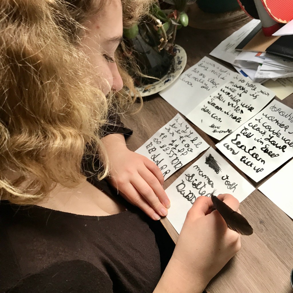 Last week she learned to knit (thank you Fish!), and this week she is practicing her cursive with a quill and ink (she likes to make her own ink, too). She is also crocheting a fox, made cupcakes, is planning her summer art series in her Crow’s Nest, and whipped up a Boxelele that almost really plays (I think she’s moving on to a cigar box uke this week, she has the plans). The snow is already ice and there is more snow on the way, so I am still holding out for a sledding party!