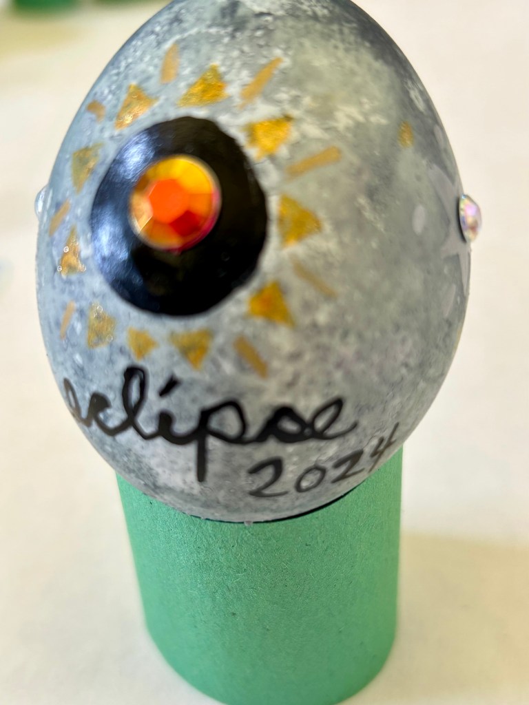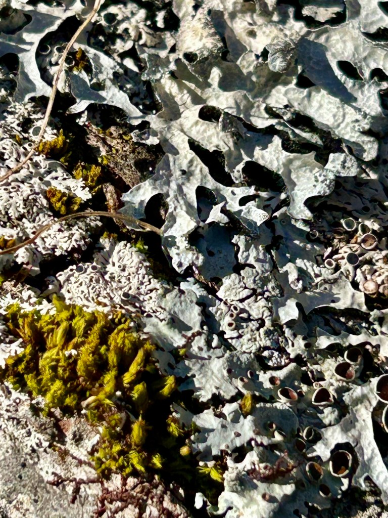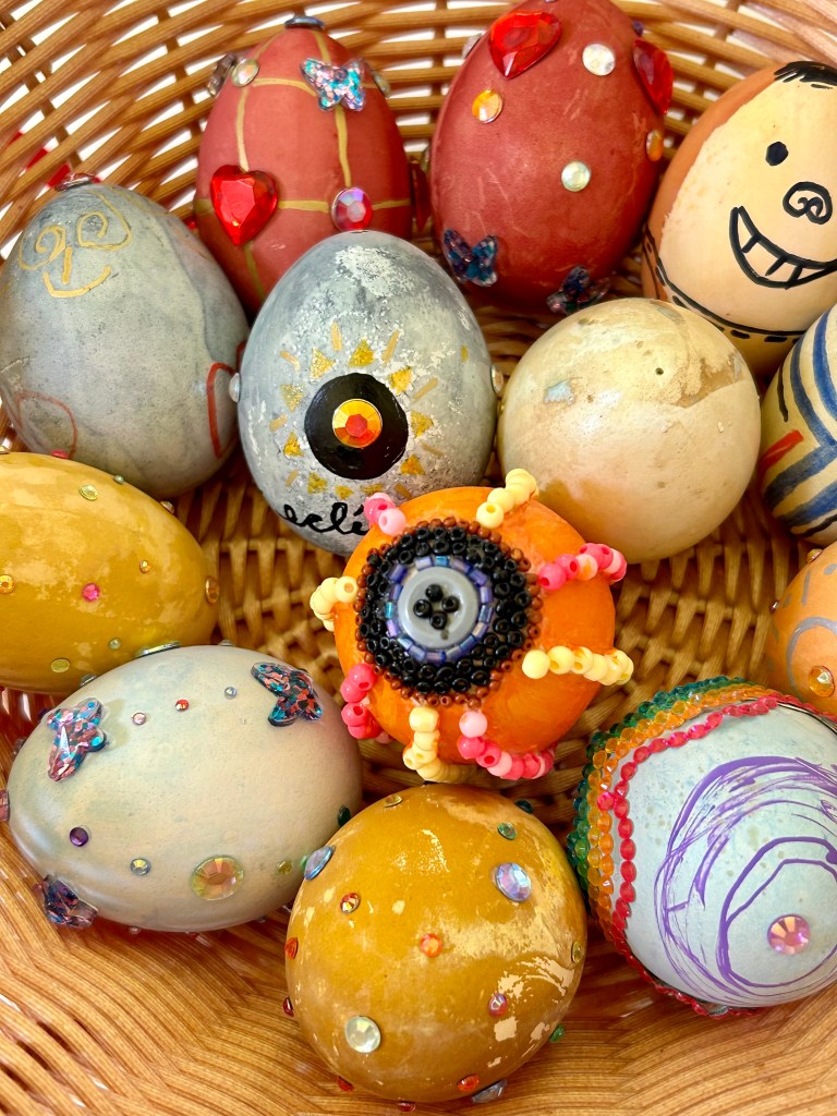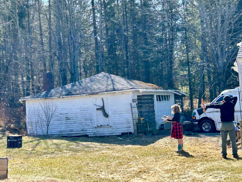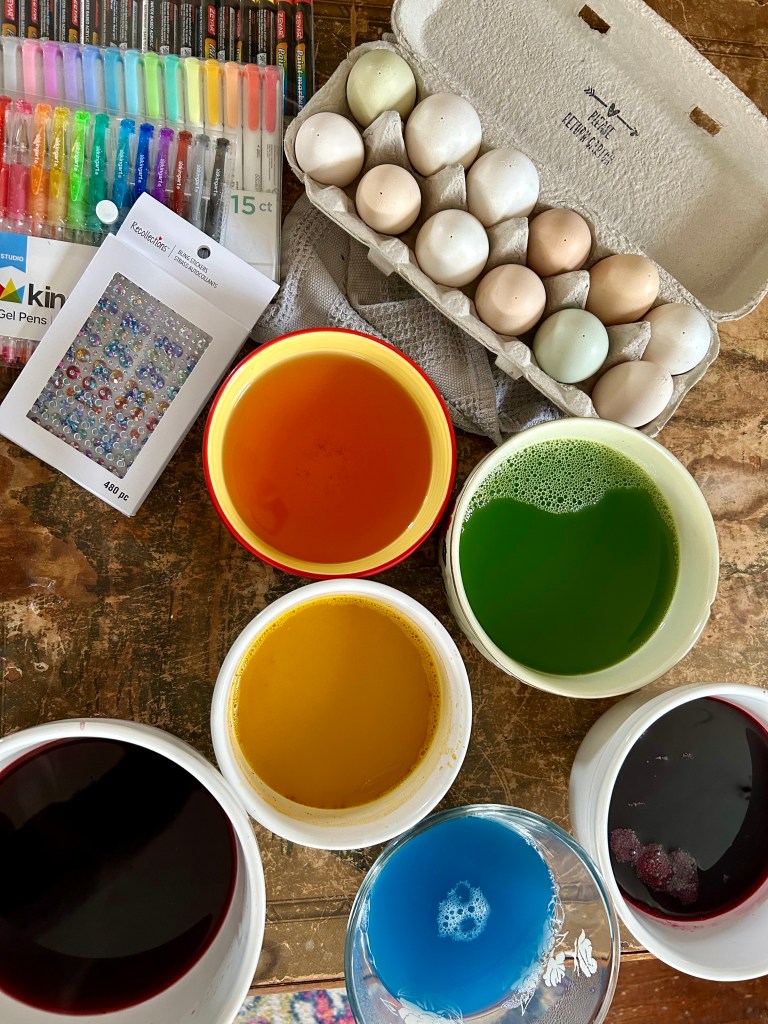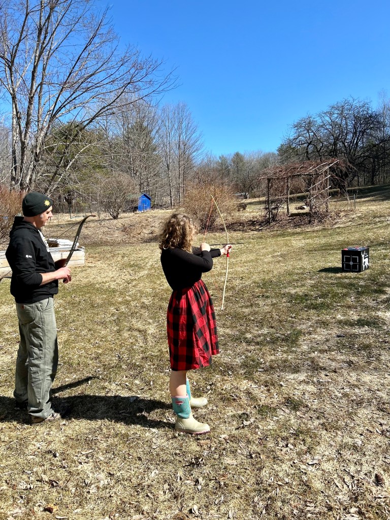 Until then, D decorates her Spring eggs (and thanks to our wonderful farmer friend who cobbled together a dozen white/light eggs for us from the rainbow boxes of organic farm fresh egg cartons) — she likes to blow them out, dye them, and this year cover them in gems and metallic paint markers (homestead bling). And then we hide them (again and again) inside the house for her to find (she loves it). There was a day or two that was beautiful and sunny — I was out and about gathering usnea and photos of other lichen, tiny fungus, and impending Spring growth while D & J practiced archery and played frisbee (because there was actually some yard to play on for a day).