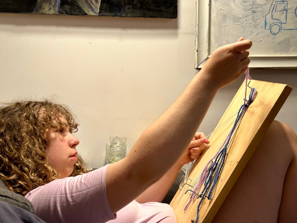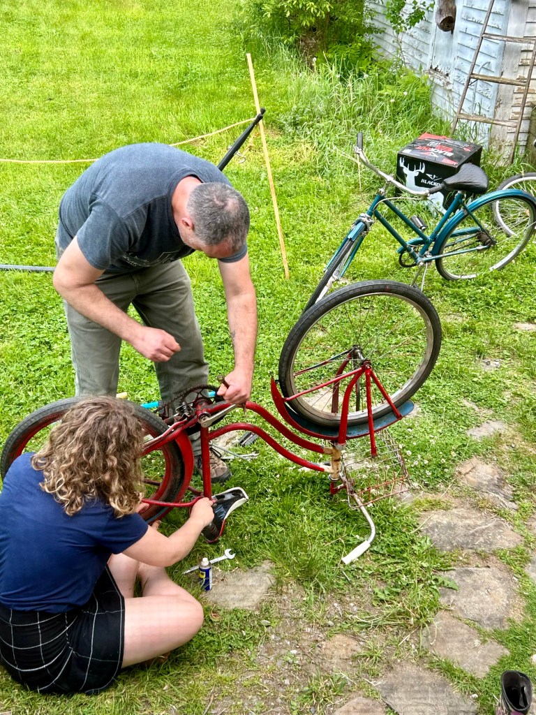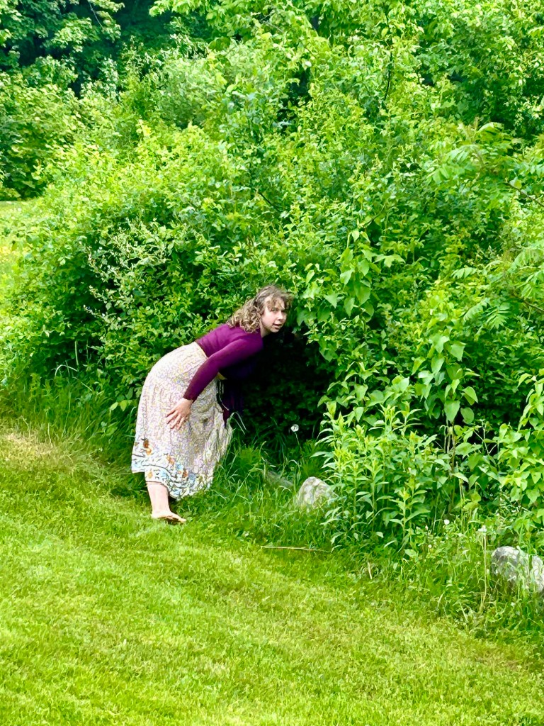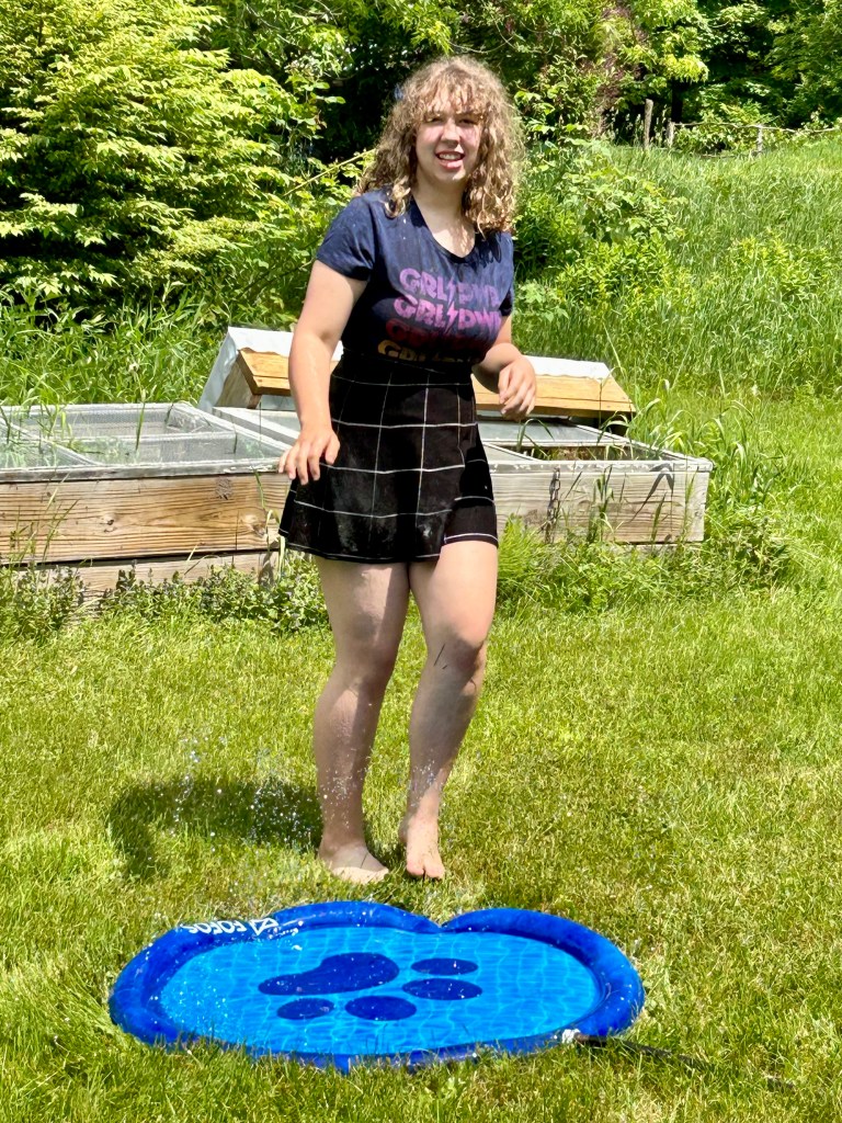 As we lead up to it, Duende has been out and about more. Rollerskating, of course, on Tuesday-delivery-day (though she misses her old roller skating partner at the park), badminton and archery in the backyard (though she needs an actual bow, she has a little handmade one but she’s too big for it now, but not yet big enough for Josh’s, though she does her best), and the other day J and she busted out the old bikes from the garage to start working on them (she has some detailing dreams now). Today she is mowing and making bracelets (she even made herself a platform with hooks to help her, and now she’s adding beads and buttons). She found a splash pad, a sprinkler, and Betty’s kiddie pool to get a little water play in, too. Then Betty came by to cool off!!! It was as if she invoked her; my wonderful little wytch.