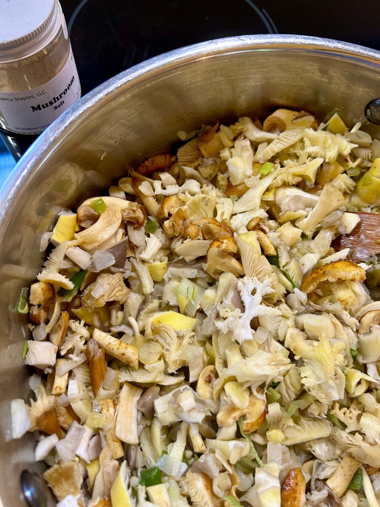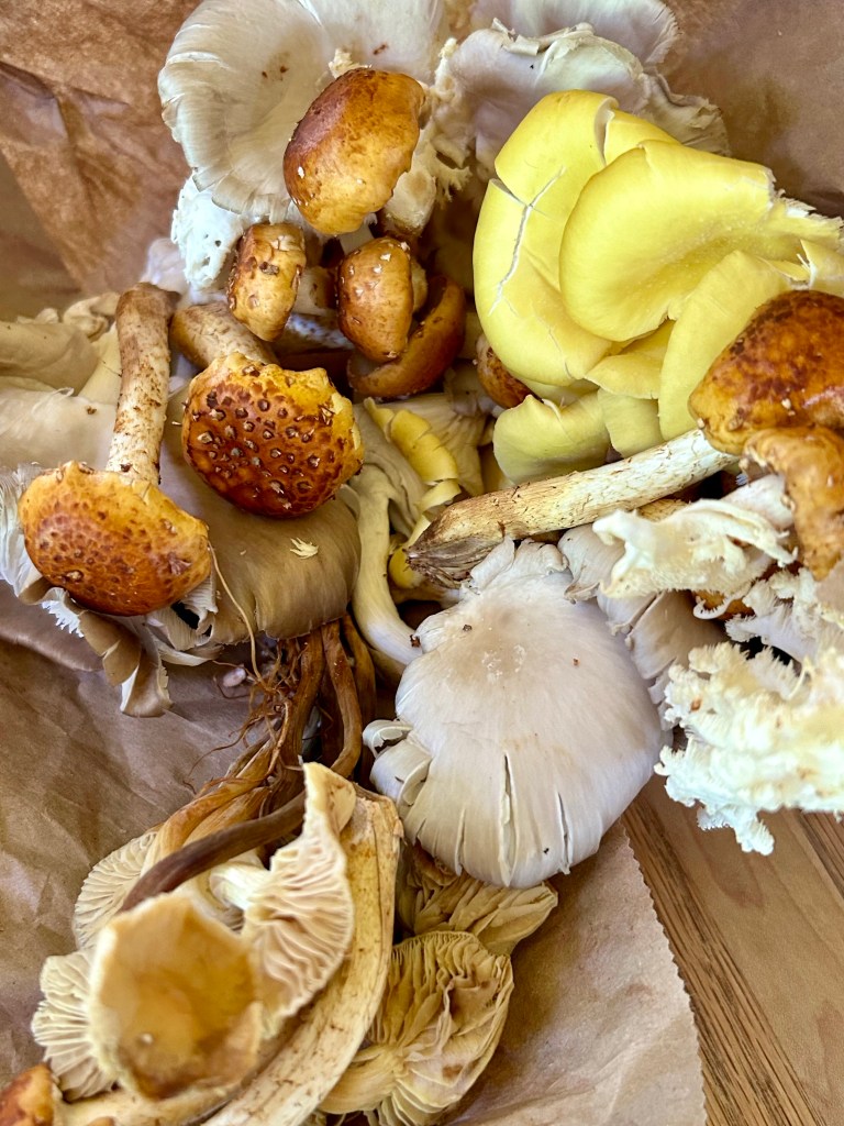 We have the most amazing mushroom growing/selling folk at our farmer’s market (Wild Fruitings); they sell gorgeous gourmet Oyster mushrooms of many colors, Lion’s Mane, Chestnuts, Pioppino, Enoki, Trumpets, Shiitakes and probably some I’m forgetting or don’t recognize. They grow the gourmet but they also forage and offer some dried and make medicines. They also work with the awesome spice guy from Spicy Staples (previously known as The Chef’s Cupboard) and offer a Mushroom Salt that I use here.