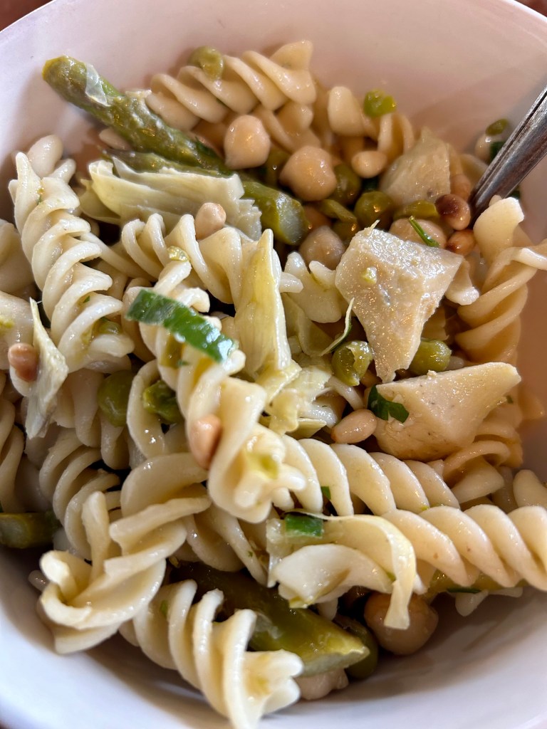Which, is all to say, that a pasta salad full of lovely green things sounds like a great match for late Spring/early Summer (or really any time as many of these additions can be seasonal). We started here with fresh peas, garlic scapes, and asparagus, then added artichoke hearts, chickpeas, and lovely lemony-mustardy dressing. I could add Feta or black Kalamata olives to this and not be upset, too. You could also switch up the chickpeas for a firm white or butter bean, use either frozen petite peas or snow peas (instead of fresh snap), green onion, green beans (fresh or frozen, regular or haricot vert but I wouldn’t do French cut), broccoli or cauliflower, etc. Add all kinds of fresh little herbs — Chives, Thyme, Marjoram, Tarragon, Savory, Parsley, etc. Have it as its own meal or pair it with a big piece of safe-source fish or something grilled. Leftovers are delicious.