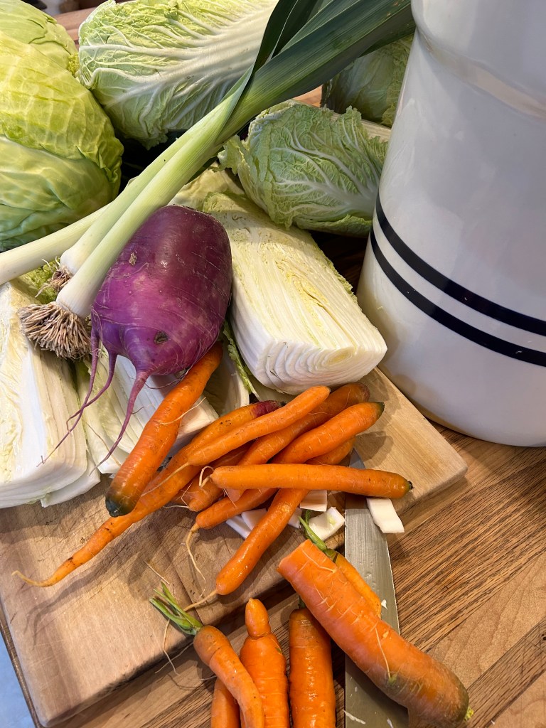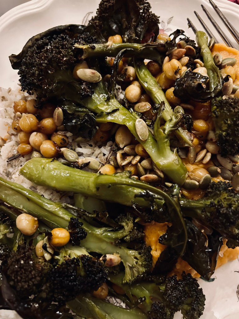 Fall roasting is just our favorite. We fall back on sheetpan roasting once or twice a week — in the Summer (we call it a Broil, though it’s generally just high heat roasting now that we have a true convection): we fill the shallow pan with even size pieces of young peppers, cherry tomatoes, baby eggplant or zucchini/summer squash, maybe chunked chicken or fish, olive oil and sea salt, gathered herbs (we always have lots of marjoram in the Summer), garlic scapes, and roast until we’re happy with it (400 degrees, about 20-25 minutes). Having it with a crunchy Baguette or rice if we need to mix it up (it’s also great to then spritz with red wine vinegar or a white balsamic, chop finely and stir into cooked farro — makes a great party Summer salad, per J.O.).