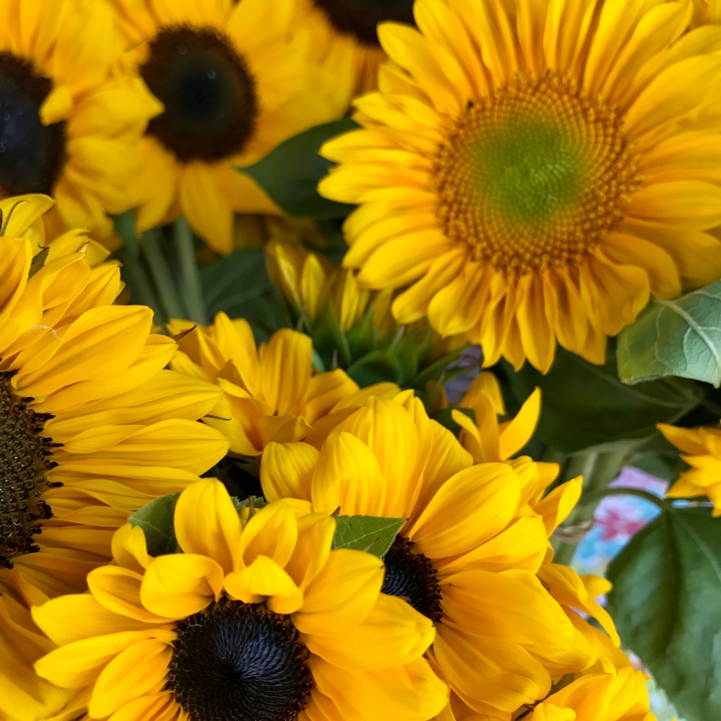 The fog was beautiful this morning, the sun was impossible to see but came through in the pictures. There were Maximillian Sunflowers, and a variety of Sunflowers in the garden, below the Sweet Pea trellis, amidst the tower of beans. There were dewy spider webs hanging like ornaments from the apple trees, also decorated with apples — so many apples.