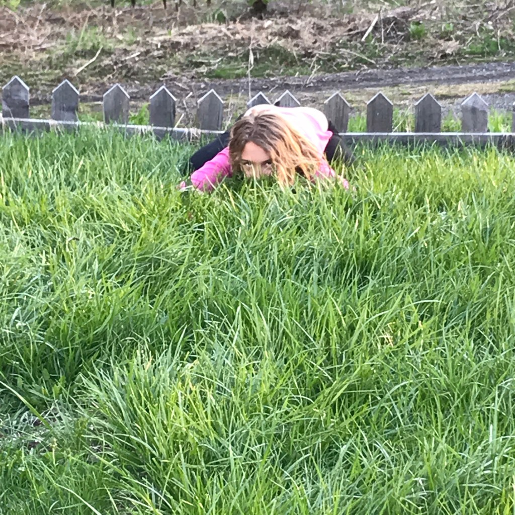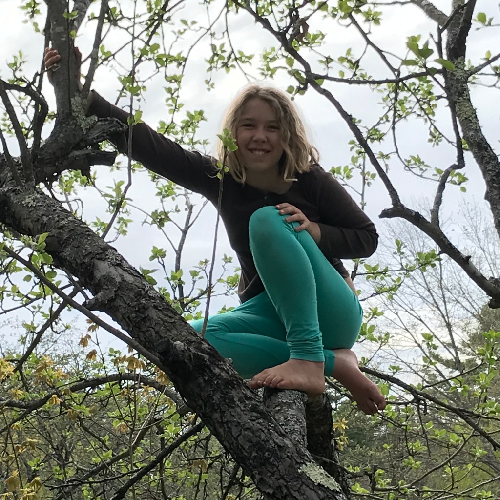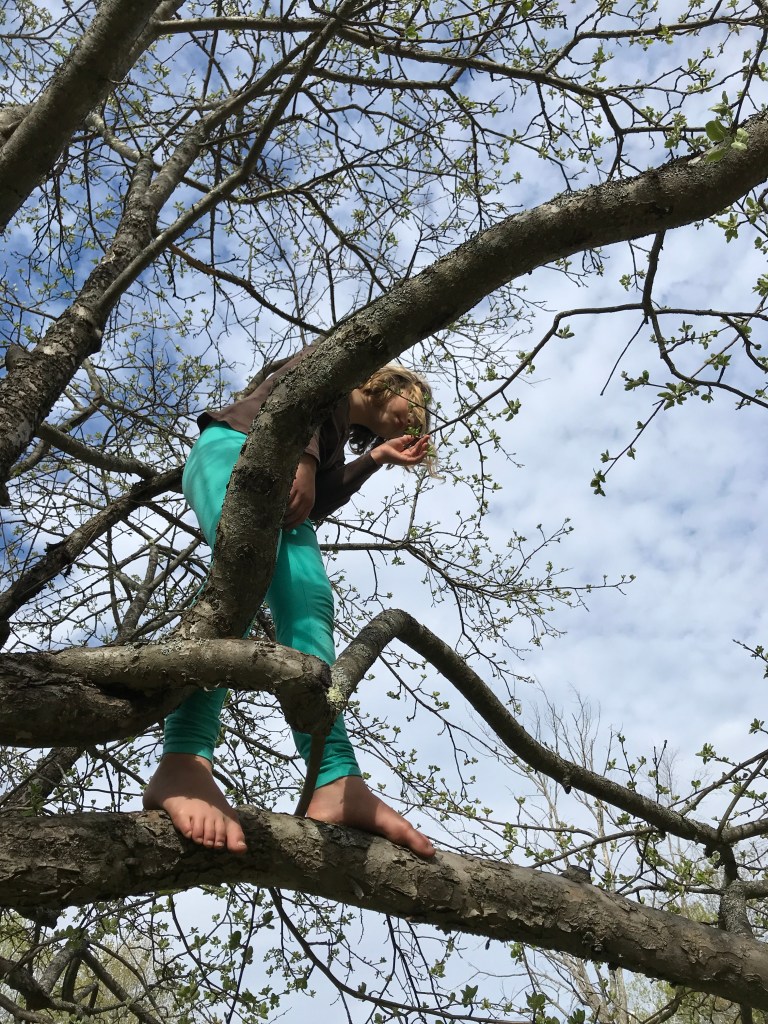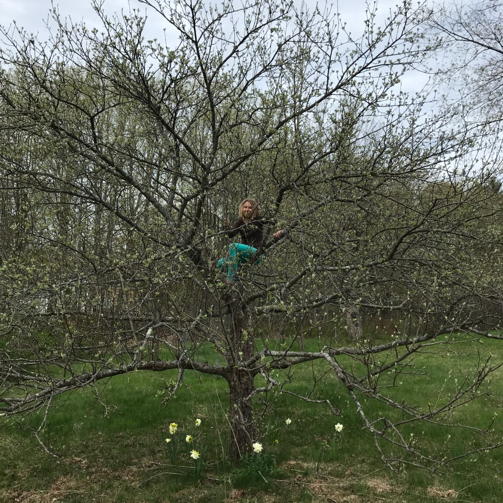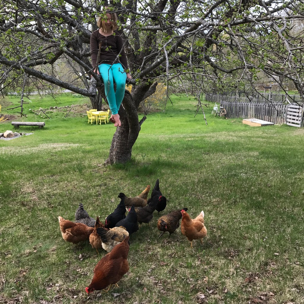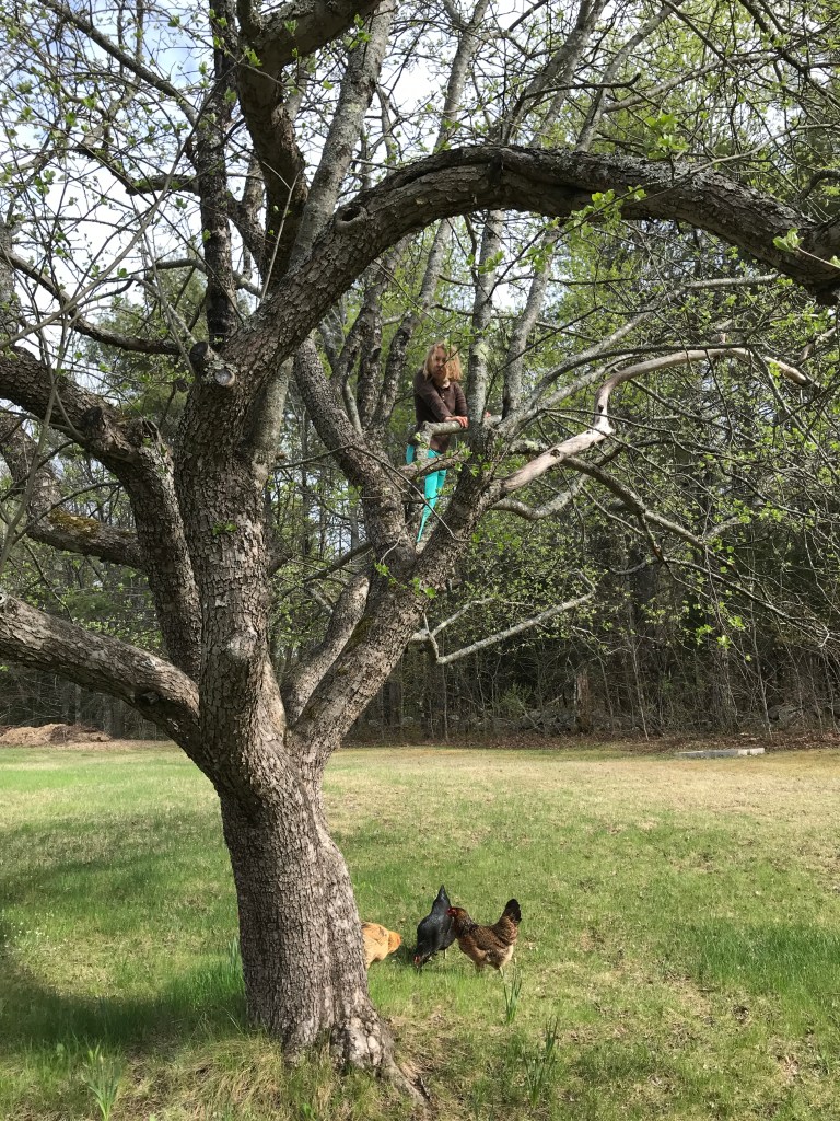 On a perfect day you can usually find Duende up a tree! Most of our older apple trees are kooky with lots of crossing branches and good places to grip – she can get up into most of them (Ted still confounds her, his mid-section is still just a little too high for her to get up into). When she’s not in a tree she’s either making mud cakes or baths, or hiding like a wild puma behind clumps of grass so she can jump out and ‘attack’ the dog, or us, sometimes a wandering hen.