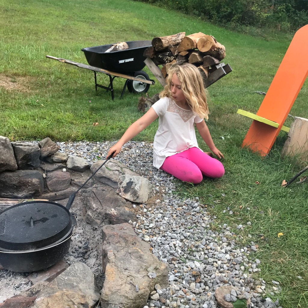 The agenda of a free 10-yr-old is certainly something to admire and emulate. She wakes up when her body tells her (anywhere between 7 and 9), feeds the pets, and forages for food – sometimes something sensible like cereal or toast, sometimes something ridiculous if it is around like ice cream or fruit crisp, or cold pizza (today it is leftover enchilada). She likes to watch a show in the morning; she’s not quite awake yet but it doesn’t take her long to get there – sometimes she’s up and raring to go. After a show, she comes out to join us in planning our day – this is when she decides who is more interesting to be with or if she should go forth on her own (building chicken coop nesting boxes? taking tent caterpillars from trees? starting a fire in the firepit? or making gnocchi, mending clothes, weeding the garden? or working on her own art, swinging on her swing, digging in her rock ‘mine’?)